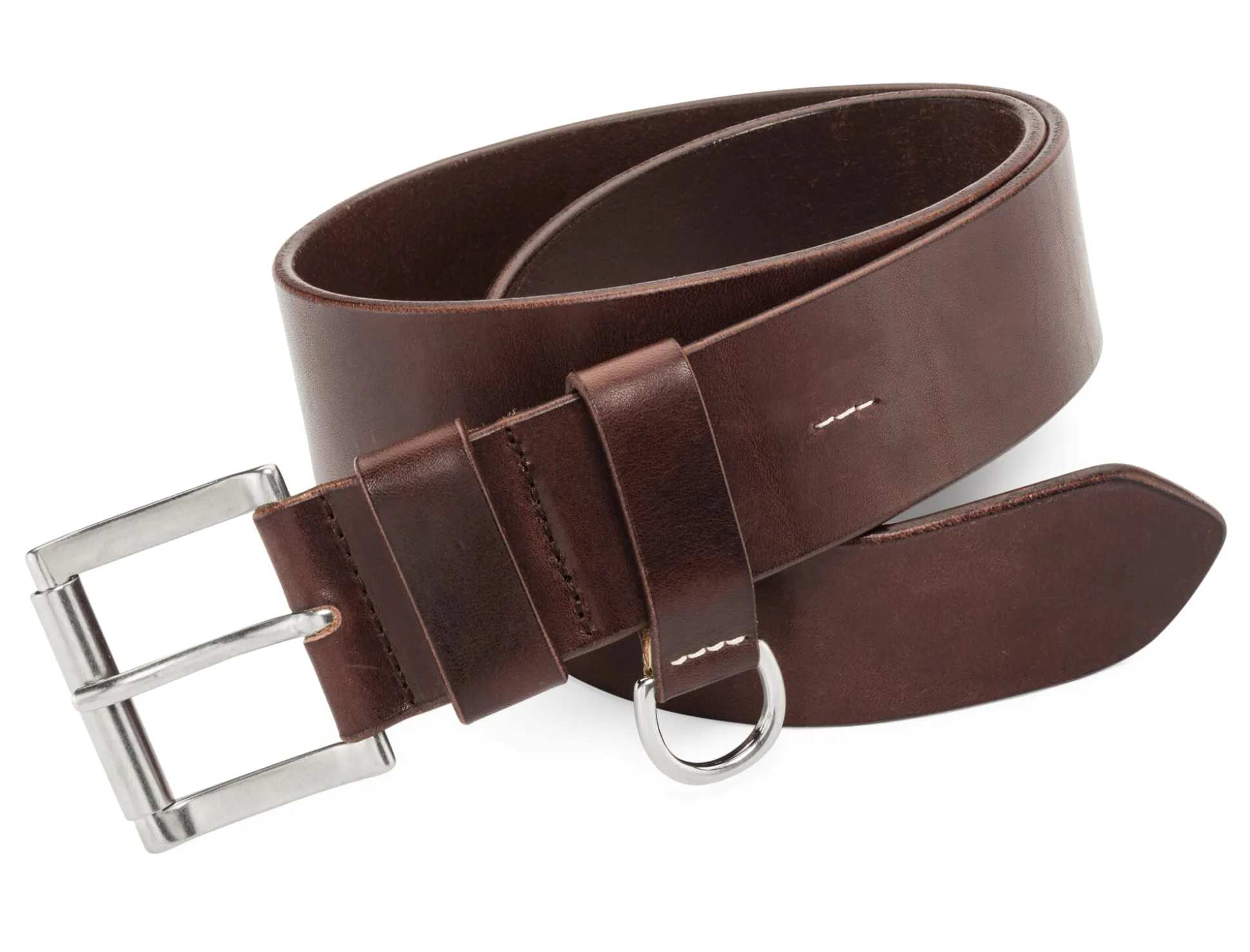 Das Rindleder für diesen Gürtel stammt aus dem Rückenbereich der Tiere (den sogenannten Croupons, dem wertvollsten und besten Teil). Es wird in einer deutschen Gerberei über wenigstens zwei Monate pflanzlich gegerbt und anschließend anilingefärbt und mit Bienenwachs behandelt. Die Rollschließe und der D-Ring werden in einem italienischen Familienbetrieb aus Messing gegossen und galvanisch versilbert. In der Ledermanufaktur Kreis in Offenbach werden nach dem Lederzuschnitt die Kanten gefräst, in mehreren Durchgängen geschliffen, in Lederfarbe gebeizt und anschließend mit Hartwachs poliert. Diese traditionelle Arbeitsweise ist aufwendig, dafür industrieller Beschichtung weit überlegen – und diese echte Sattlerkante kann bei Bedarf einfach mit farbloser Schuhcreme poliert werden.