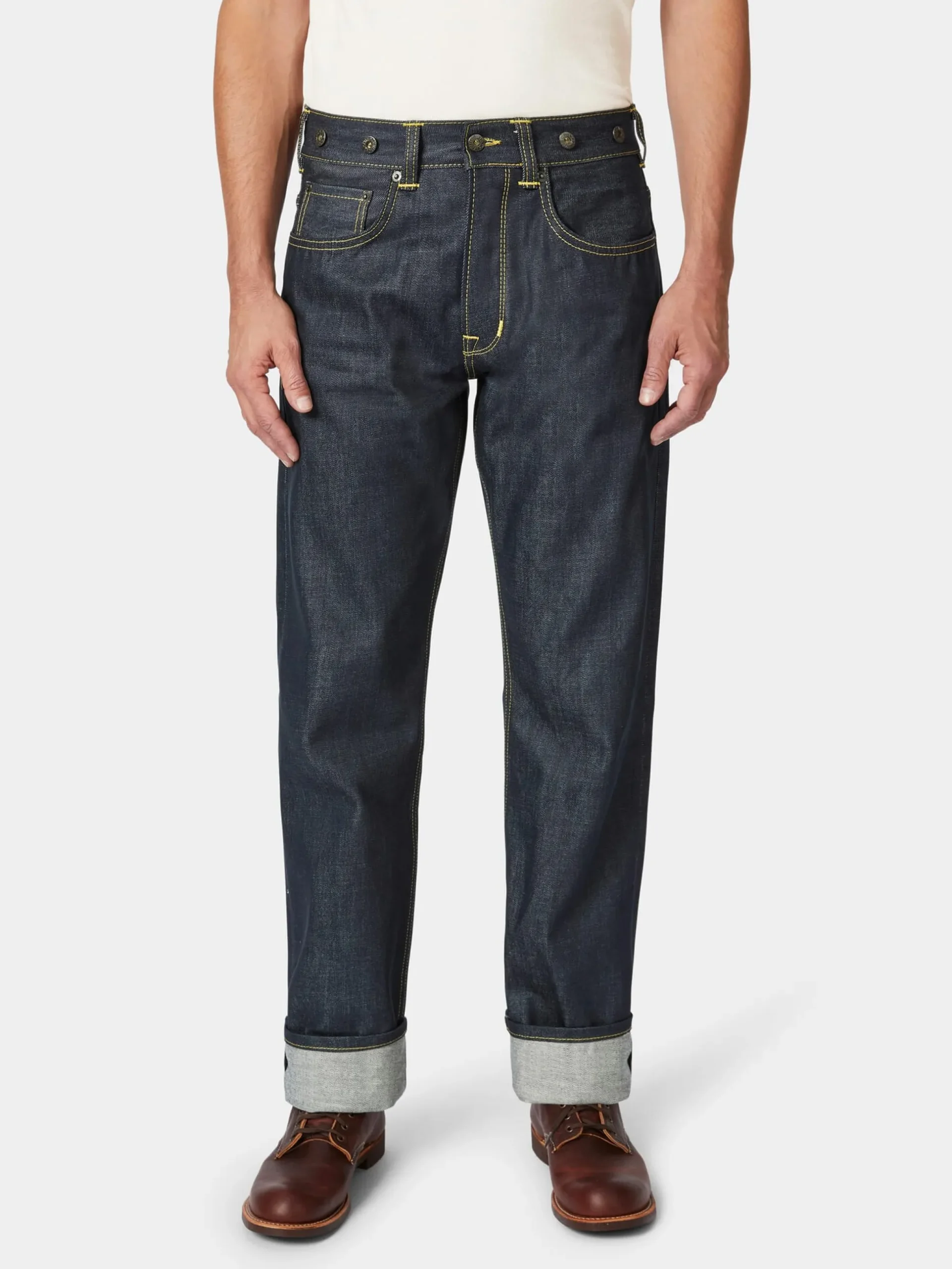 Schnitttechnisch zeigt die Hose alle Details ihrer Zeit. Neben Gürtelschlaufen hat sie Nietknöpfe zur Befestigung von Hosenträgern und den „cinch back strap“, den verstellbaren Riegel im hinteren Bund zur Weitenregulierung. Den brauchte man, da die Auswahl der Größen damals weitaus kleiner war – wem die Hose zu weit war, der schnallte einfach den „Gürtel“ enger. Gleiches galt für die Länge: Wem die Hosenbeine zu lang waren, der schlug sie eben ein Stück um.