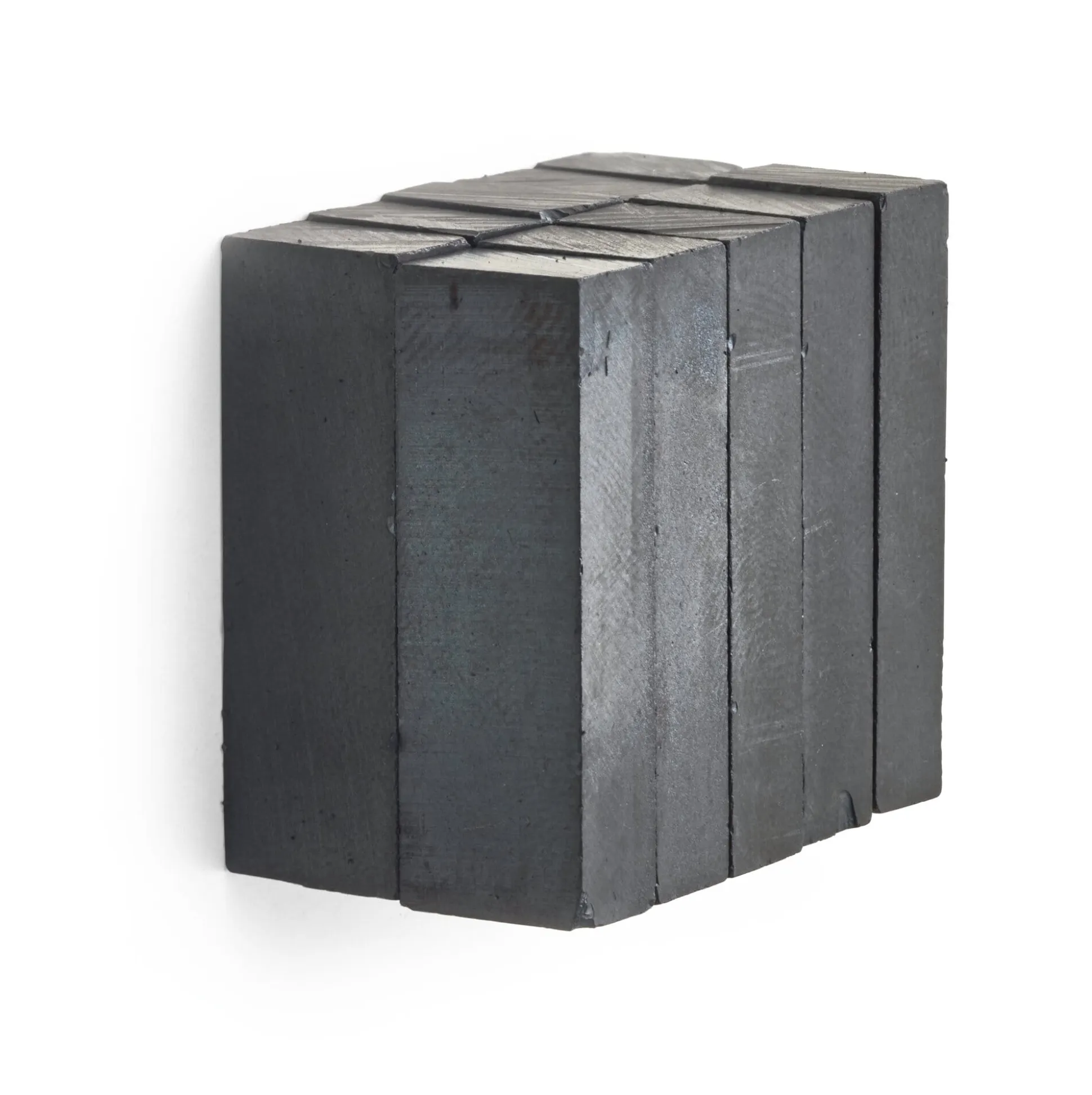 Üblicherweise ist ein Rohmagnet ein Ausgangsprodukt, das zunächst in einem weiteren Gerät verbaut oder eingefasst wird. An der Magnetwand aber benötigt er auch in der finalen Verwendung weder eine Ummantelung noch eine Lackierung. Unser Rohmagnet besteht aus Hartferrit – das sich, wie alle keramischen Werkstoffe, ein wenig spröde und brüchig verhält –, erinnert haptisch an Grafit und kann etwas abfärben (wie zum Beispiel auch Gusseisen).