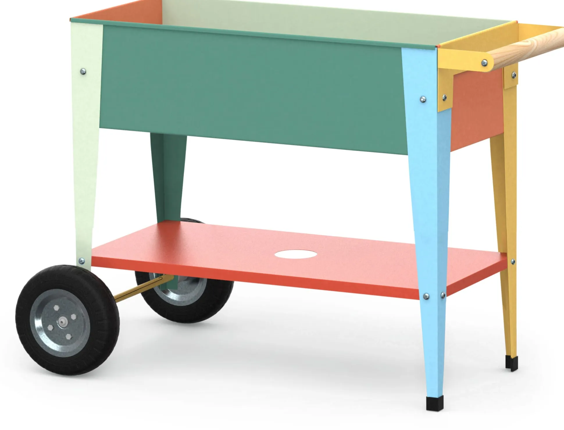 So farbenfroh und bunt wie das Gemüse, das darin wächst, blüht und gedeiht, ist dieses rollbare Hochbeet aus verzinktem und lackiertem, somit absolut wetterfestem Stahlblech. Der rechteckige Beetkasten befindet sich in kindgerechter Arbeitshöhe und ist zur Mitte hin abgesenkt – allzu überschwängliches Gießen ist also kein Problem, da überschüssiges Wasser gut ablaufen kann. Um es aufzufangen, lässt sich auf der Ablagefläche unter dem Beetkasten sogar ein kleiner Eimer aufstellen. Dort finden auch Schaufel, Harke und Handschuhe ihren Ort. Die beiden stabilen, vergleichsweise großen Räder halten das bunt pulverbeschichtete Hochbeet mobil, so dass es mit der Sonne wandern kann. Zugleich verleihen die beiden Füße ordentlich Standfestigkeit, sobald ein zusagender Stellplatz in der Sonne gefunden ist.