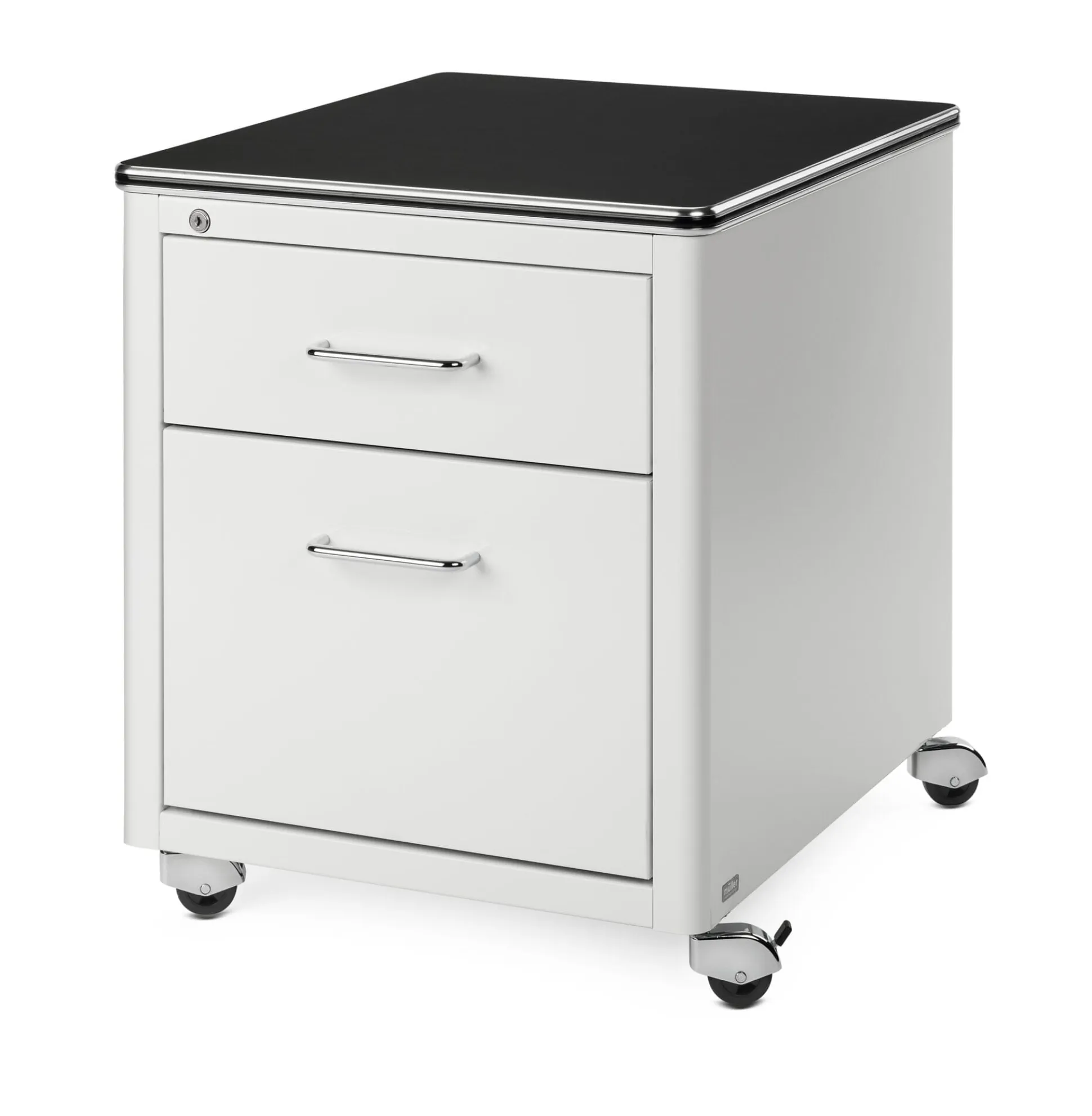 Wahlweise mit drei Schubladen oder mit einer Schublade und einem Hängeregistraturauszug ausgestattet, stellt der Rollcontainer ein funktional-kompaktes Büromöbel dar, das die Utensilien und Unterlagen bzw. die Hängeregistraturmappen der täglichen Arbeit aufnimmt. Insbesondere bietet er sich als freistehendes bzw. beigestelltes Arbeitsmöbel an, das mit seiner Ablagefläche zugleich die Funktion eines kleinen Tisches erfüllen kann. Im Bedarfsfall ist er auch als Untertischcontainer für Arbeitstische, die nicht mit einer Kastenkomponente ausgestattet sind, zu verwenden. Mit seinen vier Lenkrollen (die vorderen sind feststellbar) ist er außerdem mobil und kann jederzeit einer anderen Funktion im Raum zugeführt werden – falls Sie ihn in diesem Augenblick unter dem Schreibtisch, einen Moment später aber lieber daneben oder frei im Raum stehend nutzen möchten.