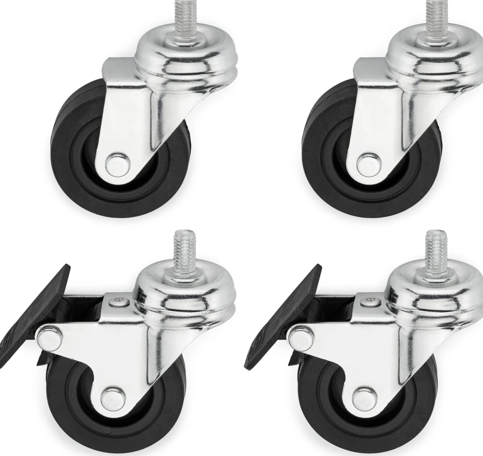 Set: 4 Rollenfüße. Gehäuse Stahl verchromt. Radbremse Polyamid. Rollen EPDM-Kautschuk. Rollenfuß jeweils Ø 5 cm, Breite 9 cm, Höhe 6,5 cm. Gesamtgewicht 666 g.