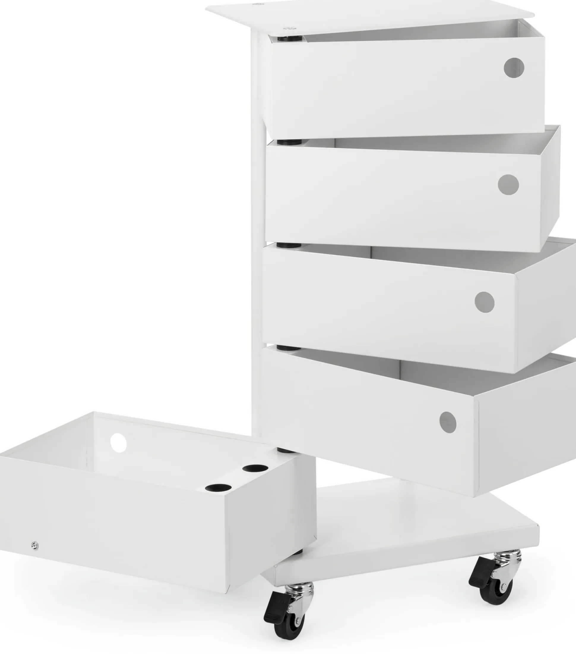 Die Rollenfüße verwandeln den Drehladen-Container in ein mobiles Designobjekt, das damit jederzeit seinen Standort wechseln kann, um seine Strahlkraft und Funktionalität unter Beweis zu stellen. Dank dem sauber gefrästen, selbsthemmenden Maschinengewinde sind die Rollen einfach zu montieren und umgehend einsatzbereit. Zwei der Rollenfüße sind feststellbar, damit sich Ihr Container nicht unversehens verselbstständigen und seine Mobilität entgegen Ihrer Zielsetzung nutzen kann.