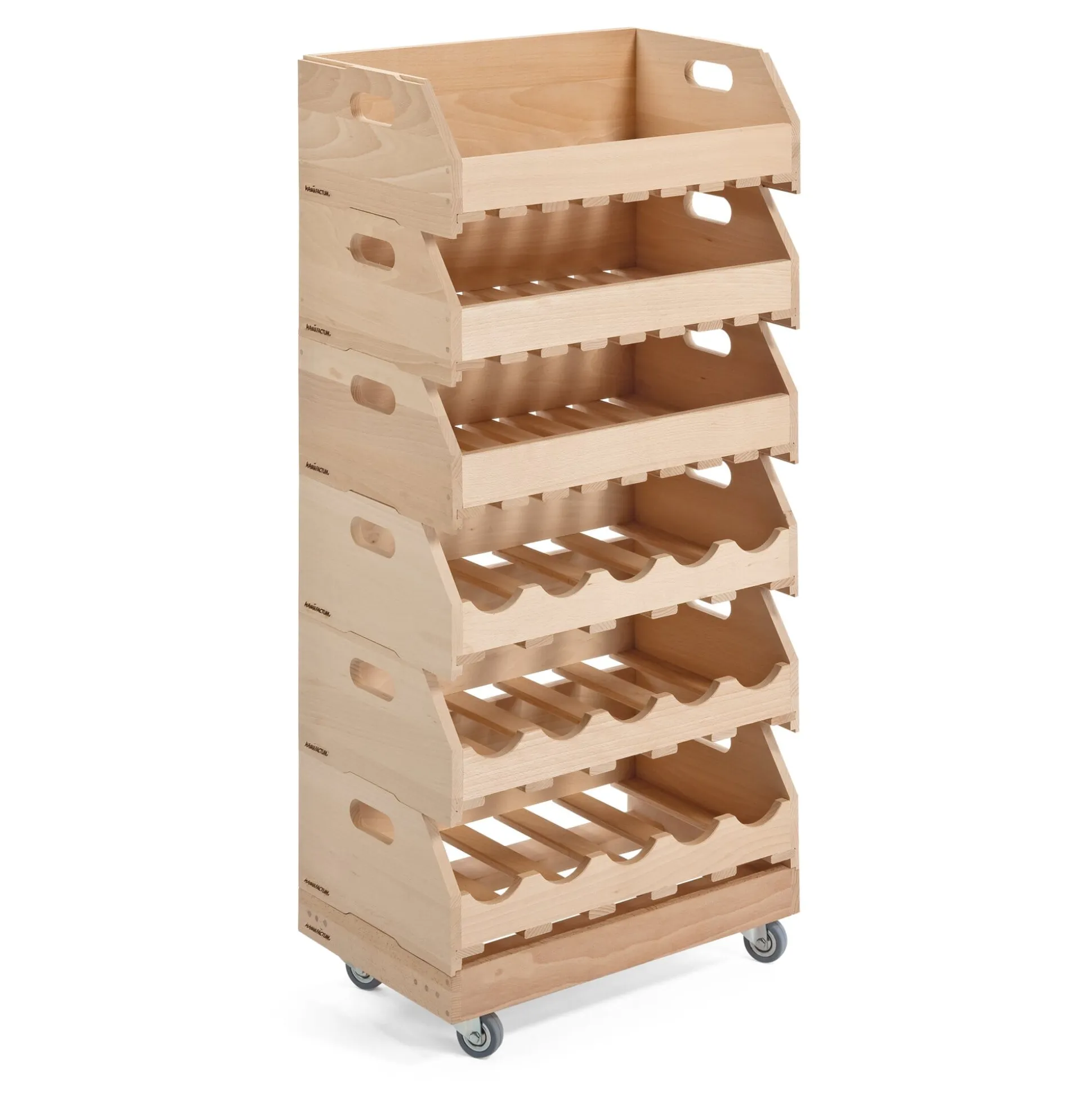Für unsere Obstlager- und Flaschenkisten aus Buchenholz: ein Sockel auf vier Rollen, der einem aus verschiedenen Kisten zusammengestellten Regal als fahrbarer Untersatz dienen kann. Gegen Verrutschen sichert die gleiche seitliche Ausformung, die auch bei den Kisten selbst für eine gesicherte Stapelbarkeit sorgt.