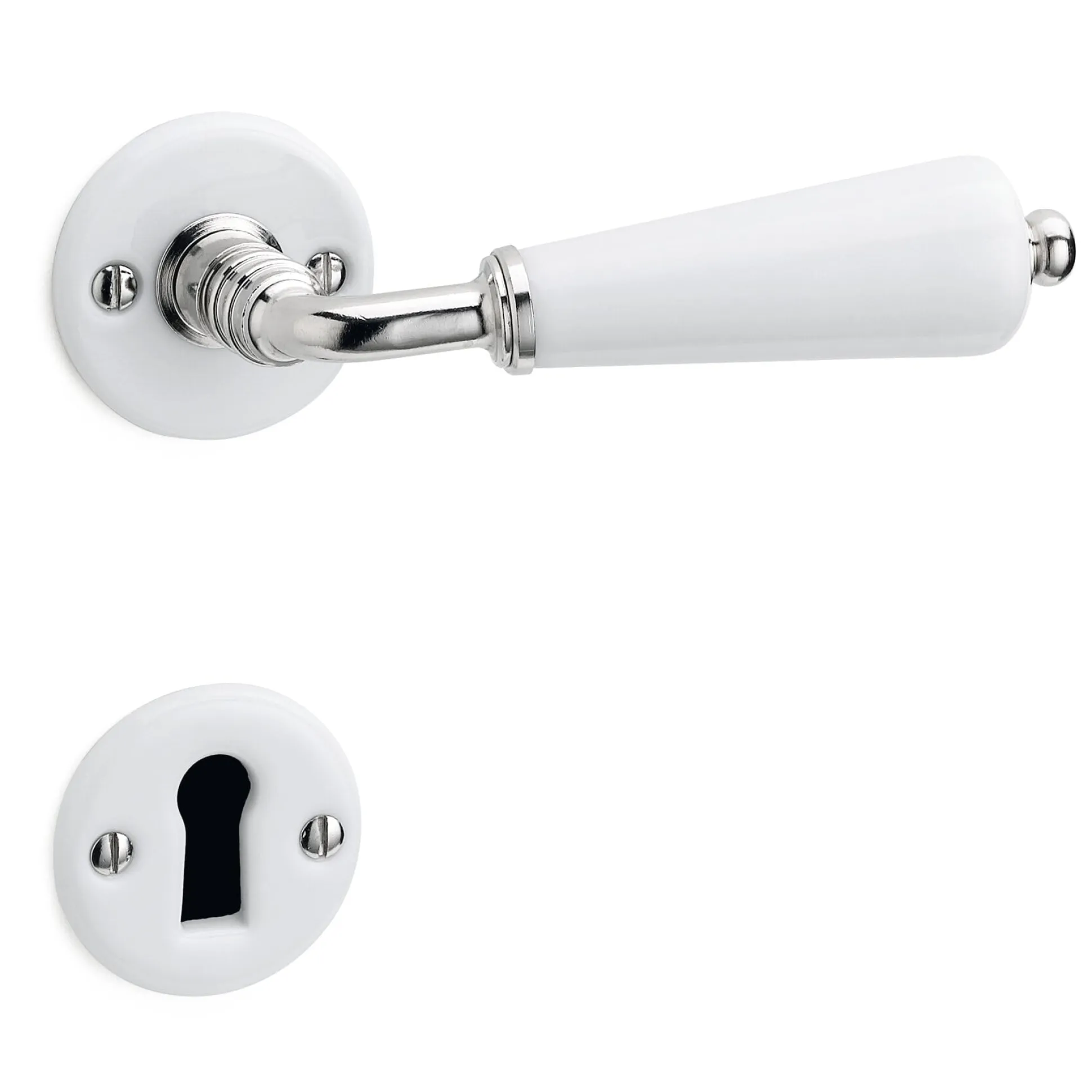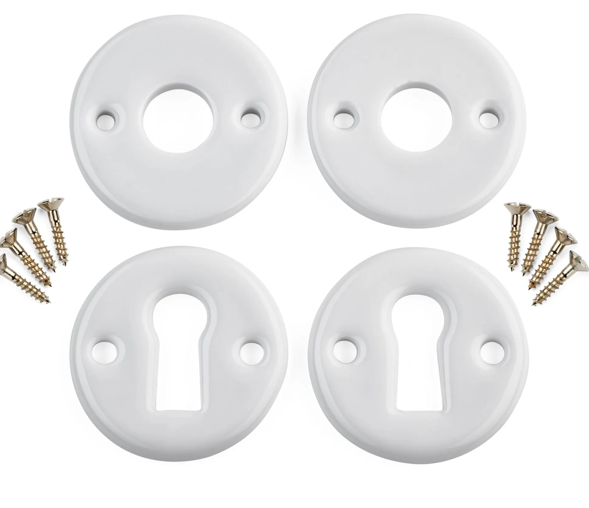 2 Schlüsselrosetten (Buntbart) und 2 Griffrosetten aus Porzellan. Schrauben Messing vernickelt.