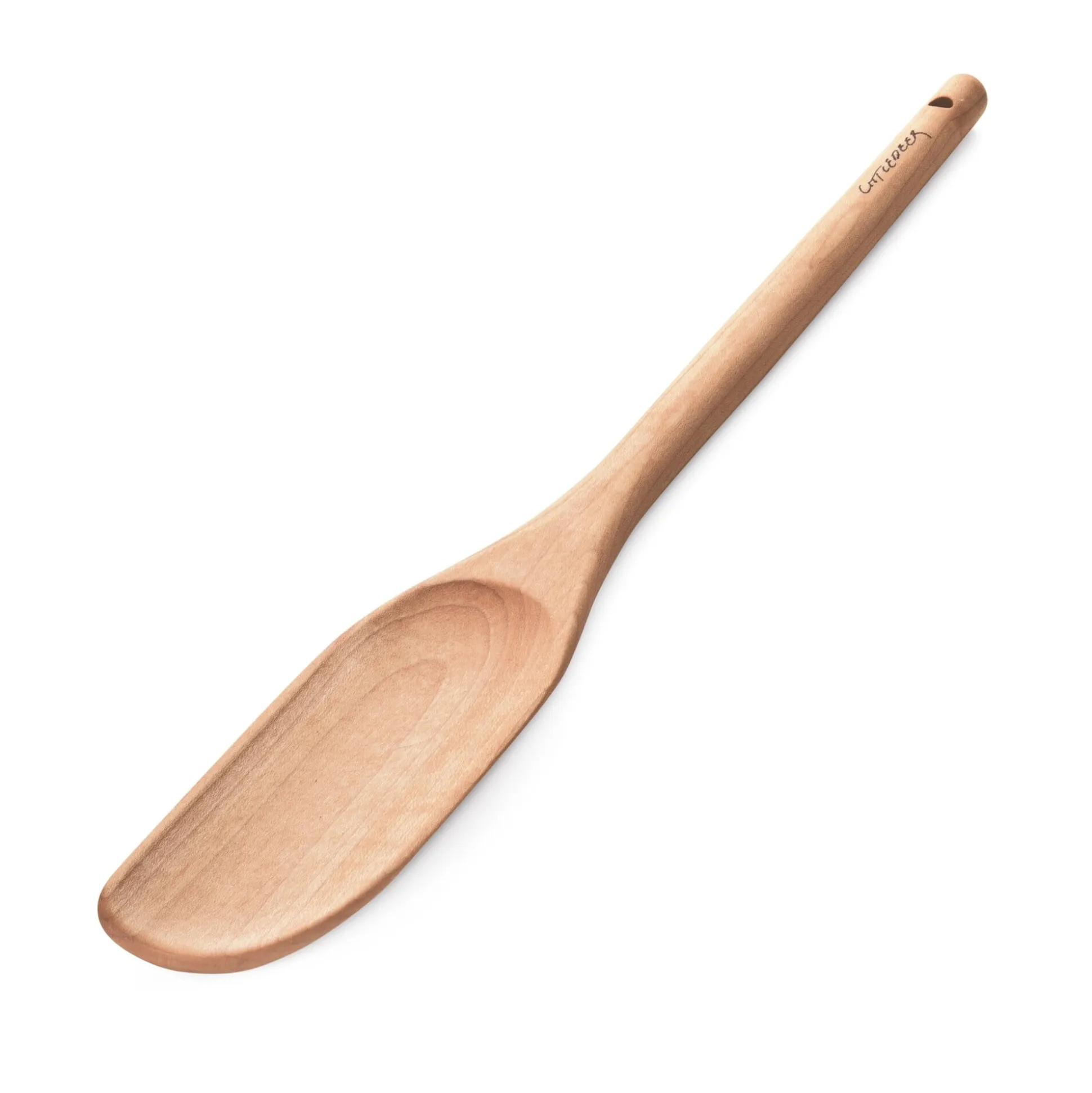 Bei dem Kochwerkzeug nun ist der Holzquerschnitt so ausgelegt, dass nicht nur die im Einsatz besonders belasteten Partien ausreichend dimensioniert sind. Die Gerätschaft unterstützt auch beim Rühren im Topf oder Wenden von Bratgut in der Pfanne eine dynamische Handbewegung. Das Ausformen aus dem vollen Holz geschieht mit der Hilfe von Bandsäge und Schleifmaschine noch in Handarbeit. Zur Verwendung kommt kanadisches Ahornholz aus der Umgebung des Betriebes, das nach dem Schleifen noch eine oberflächenschützende Behandlung mit Weißöl erfährt.