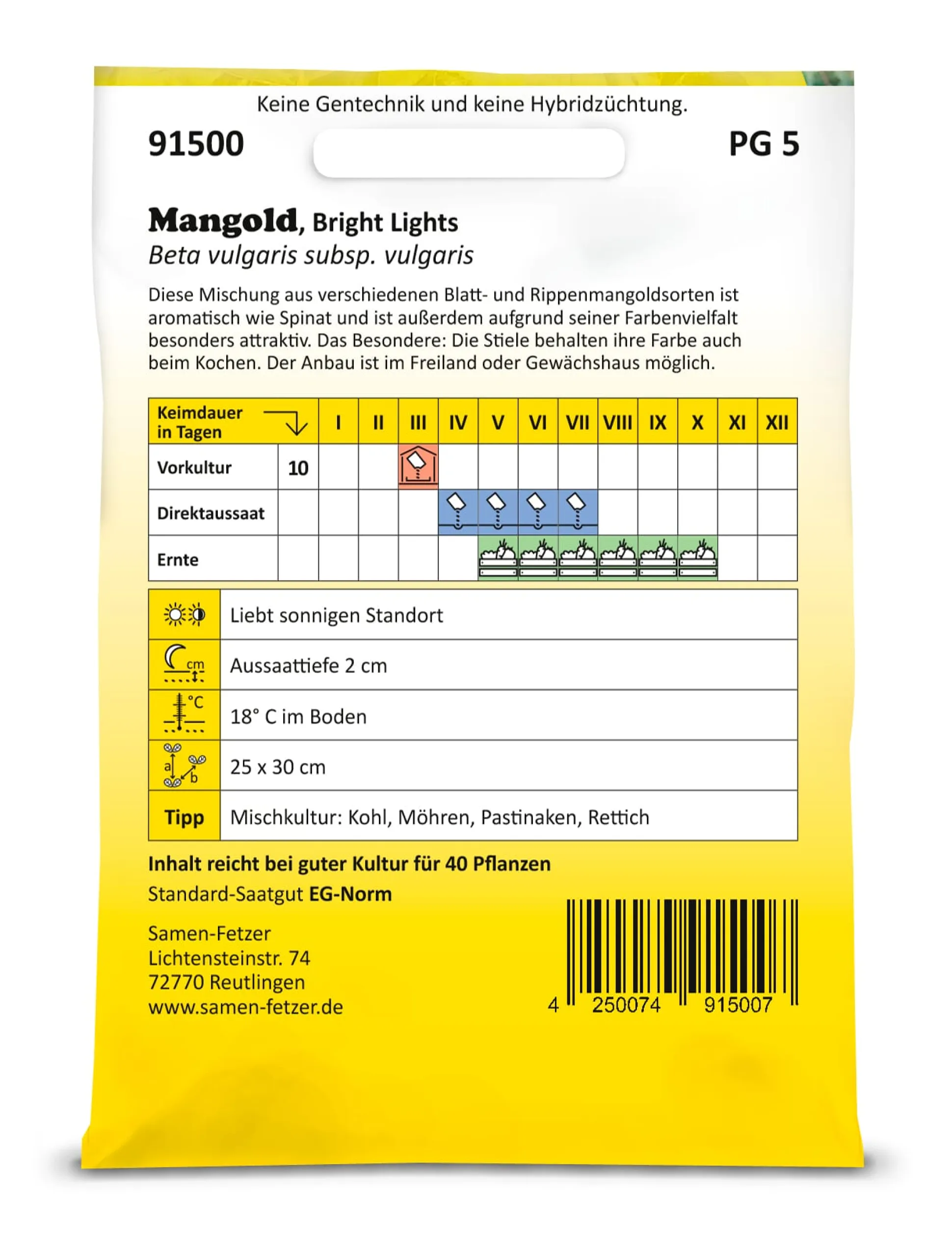 Sehr ertragreiche, aromatische Sorte mit dunkelgrünen bis rotbraunen Blättern an bunten Stielen. Die Stiele werden gedünstet oder gekocht, die Blätter dagegen wie Spinat zubereitet. Bleiben die Herzblätter der Pflanze bei der Ernte stehen, treibt sie immer wieder neu aus. So kann über einen längeren Zeitraum geerntet werden.