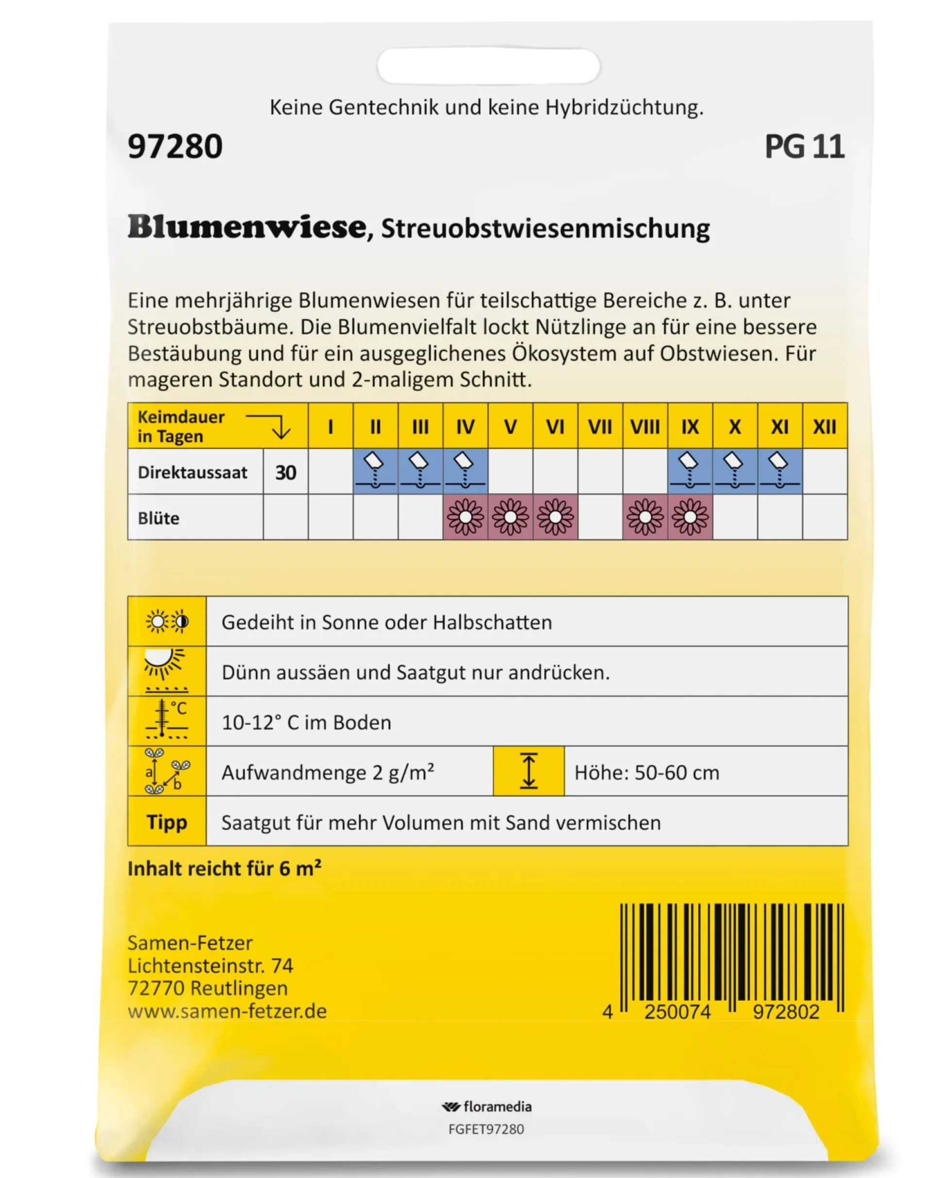 Mischung aus mehrjährigen Arten und Sorten, vorzugsweise für magere Standorte. Zweimaliger Schnitt empfohlen. Mit Angaben zu Aussaat und Pflege auf der Verpackung. Inhalt 15 g. Ausreichend für etwa 6 qm.