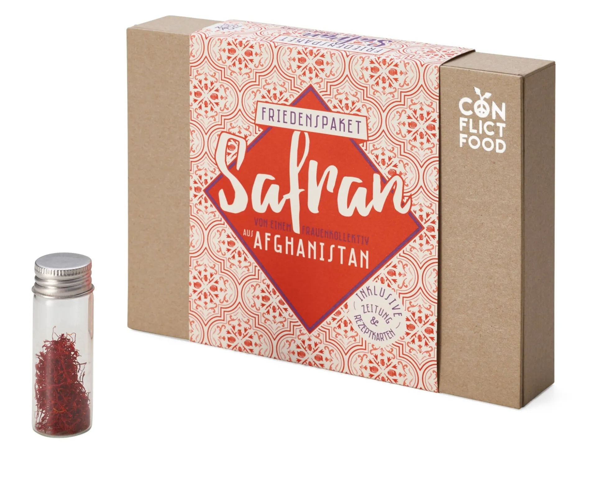 Afghanistan ist seit langem von kriegerischen Auseinandersetzungen und politischen Umwälzungen geplagt. Und das Land hat derzeit eigentlich nur ein landwirtschaftliches „Exportprodukt“, nämlich Opium. Dabei gibt es im Westen des Landes feinsten Safran, den ein Frauenkollektiv erntet und verarbeitet. Mit dem Erlös unterstützt Conflictfood jeweils Bildungseinrichtungen vor Ort. Der Safran im Glasröhrchen kommt in einer wunderschönen Schachtel, die nicht nur Rezepte und Informationen über das Projekt enthält, sondern auch eine weitergehende Nutzung ermöglicht.