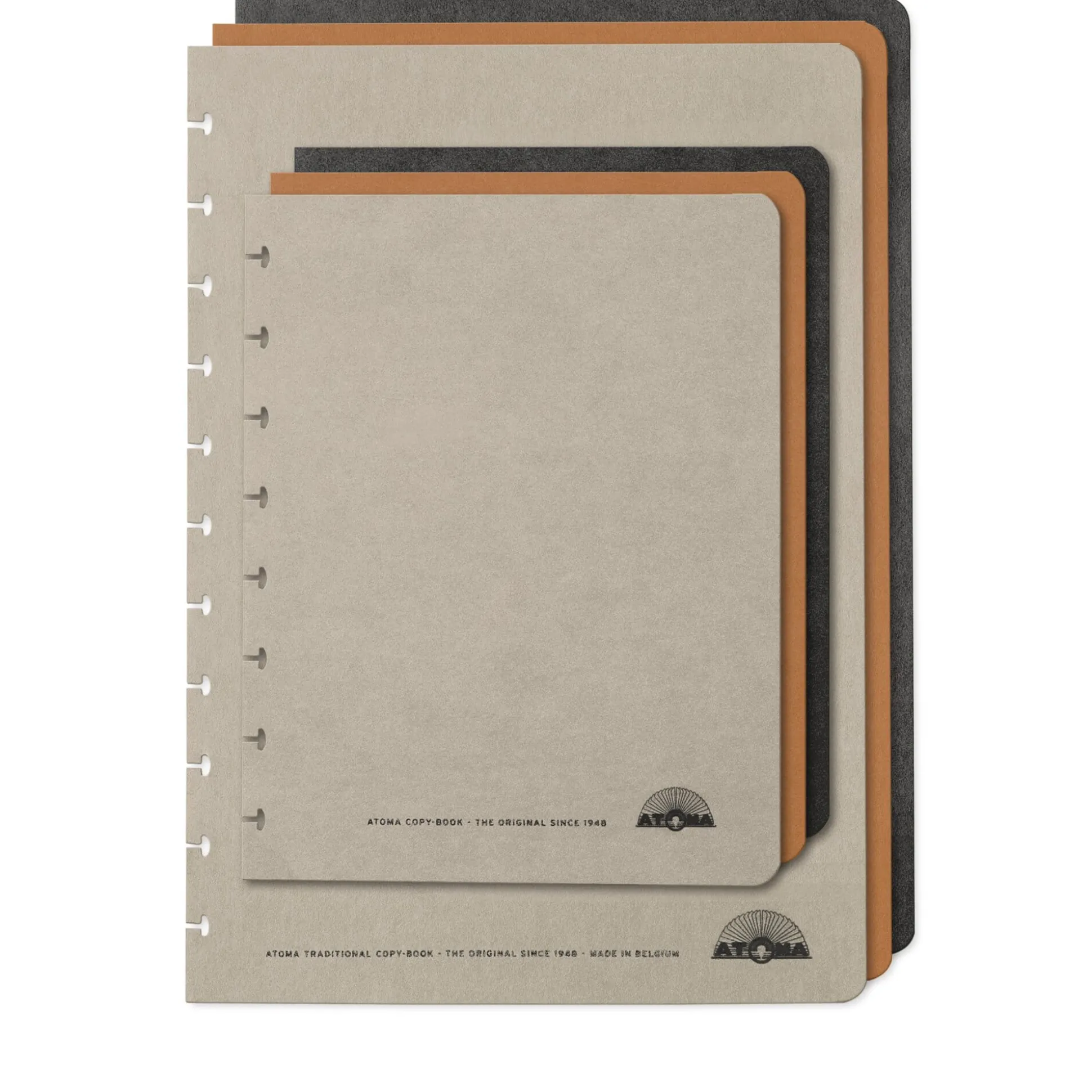Das rund 70 Jahre alte belgische Notizbuchsystem Atoma besteht ausschließlich aus rollenden Ringen und fliegenden Blättern, wobei die Ringe die Blätter am Fliegen und die Blätter die Ringe am Rollen hindern – beides bleibt aber dank einer patenten Speziallochung der Blätter stets leicht voneinander lösbar. Sie können die diversen Formular-Einlagen Ihrer selbst zusammengestellten Notizbücher also jederzeit ergänzen, verändern und nach Bedarf mischen – auch mit Formularen, Kalender- oder Adressbuchdrucken, die Sie per PC und Drucker auf den Blanko-Formularen selbst erzeugen und mit dem Atoma-Locher mit der passenden Lochung versehen.
