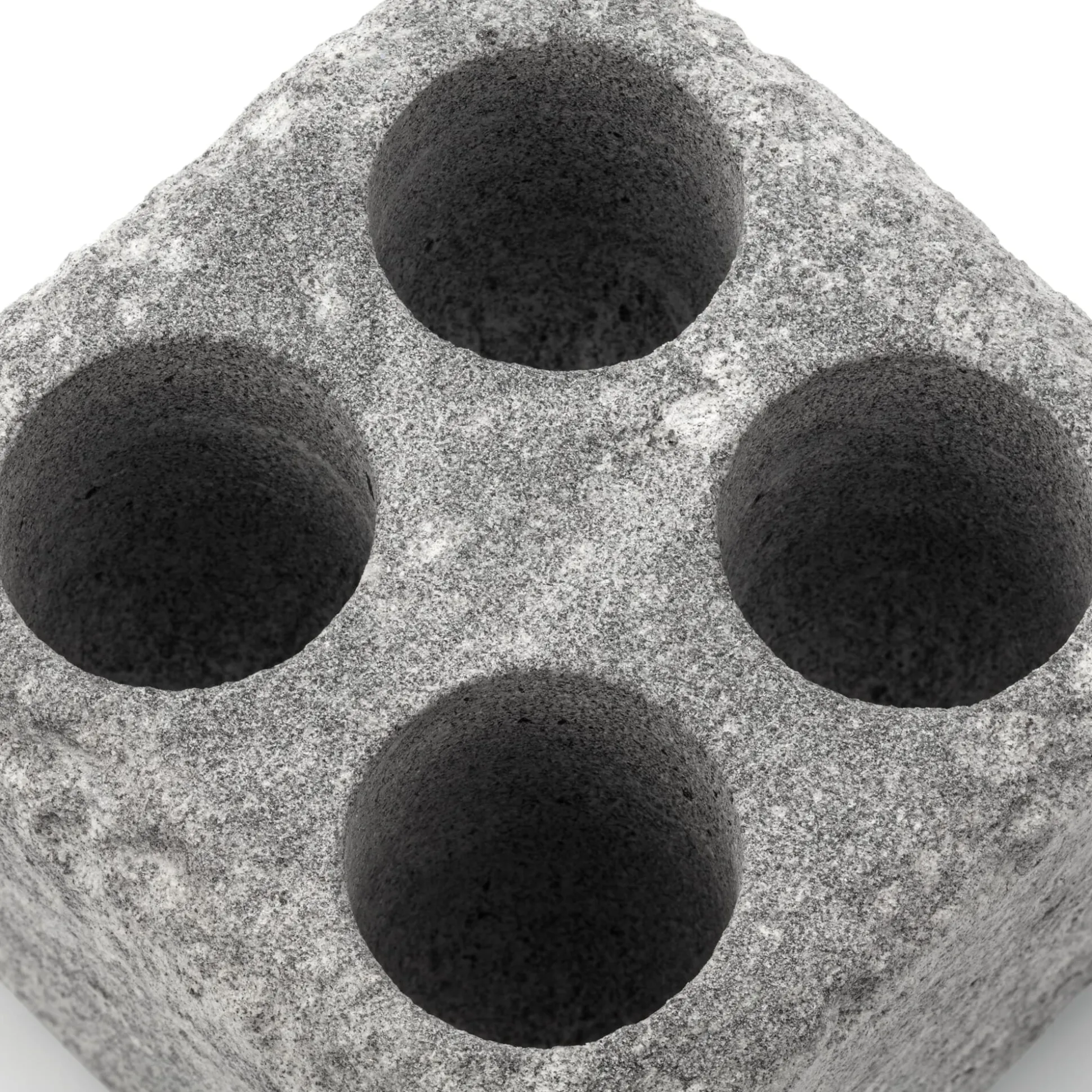 Set mit 2 Steinen aus Speckstein à 8 × 8 × 6 cm. Gewicht je Stein ca. 830 g. Volumen je Bohrung 20 ml. Hergestellt in Finnland.