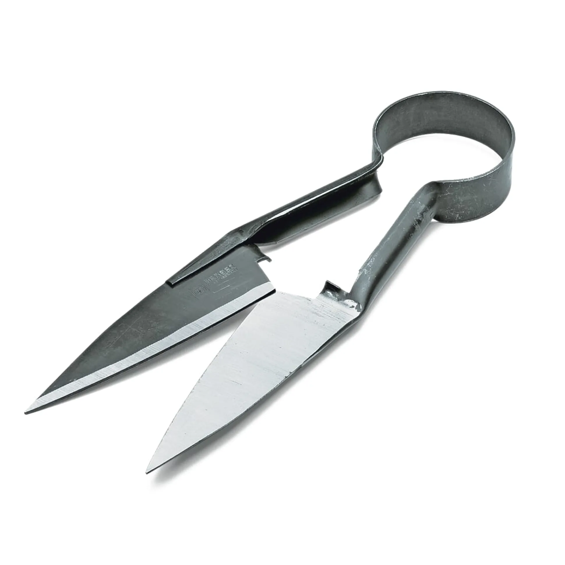Kohlenstoffstahl, selbstschärfende, hohlgeschliffene Scherenblätter. Hergestellt in Deutschland. Klingenlänge 15,5 cm, Gesamtlänge 32 cm. Gewicht 290 g.