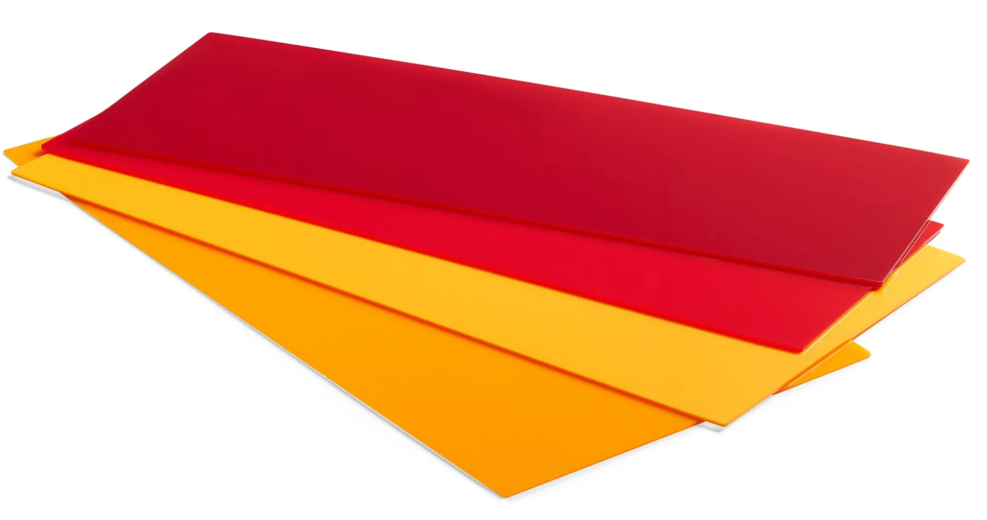 Satz von vier Schiebetüren in den Farben Dunkelrot, Rot, Orange und Hellorange oder in einem neutralen, fast lichtundurchlässigen Weißton zum Einsatz im Sideboard IRION HOCH. Die Schieber werden werkzeugfrei in die Führungsschienen des Korpus eingesetzt.