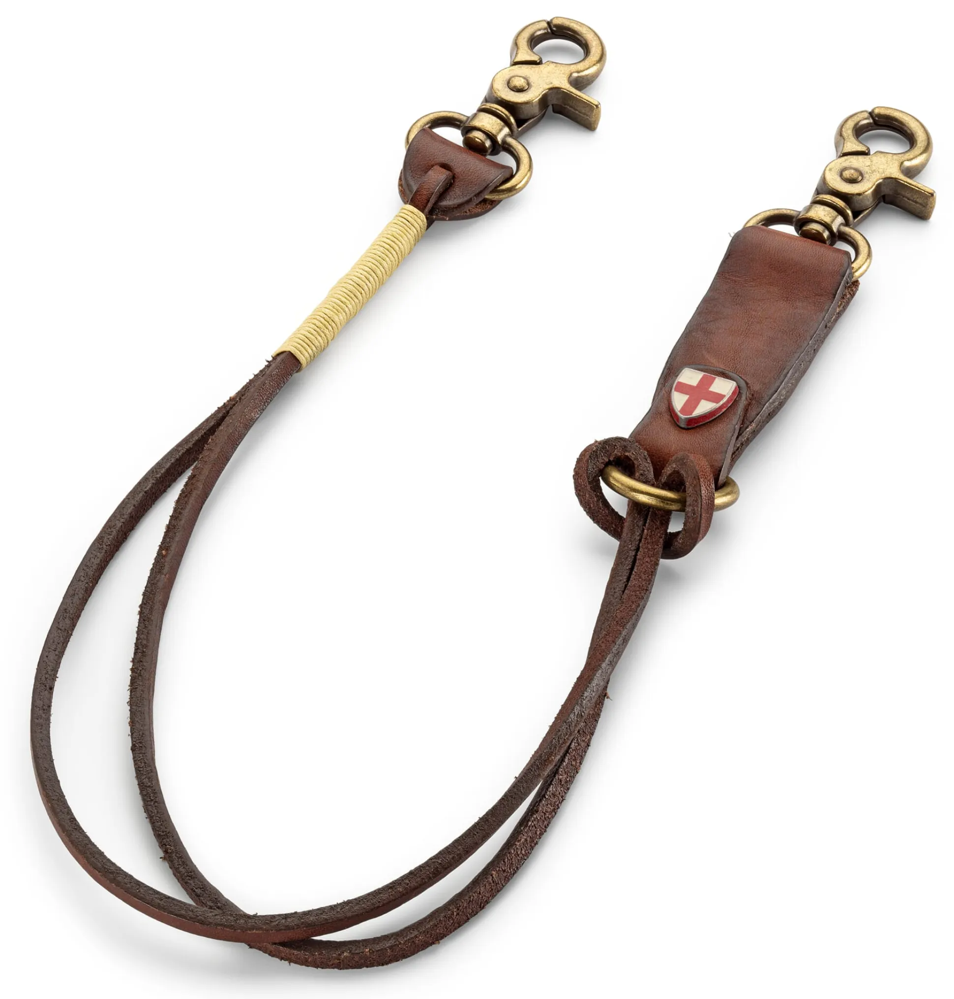 Rindleder (Stärke 3,2–3,4 mm), vegetabil gegerbt. Karabiner aus Zink-Aluminium. Baumwollband. Hergestellt in Polen. Komplette Länge inkl. Karabiner 53 cm.
