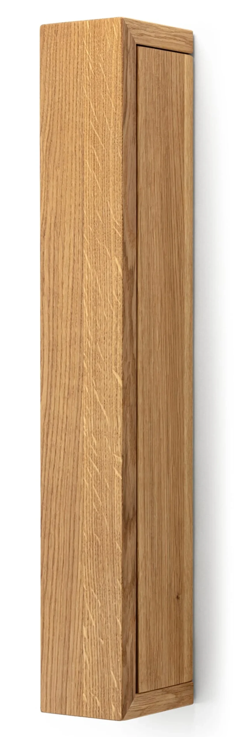 Eichenholz geölt (Herkunft Deutschland). Rückseitig mit zwei Schlüsselloch-Aufhängern. Breite 8 cm, Höhe 53 cm, Tiefe 10 cm (auseinandergezogen Tiefe 8 cm). Gewicht 1,6 kg. Befestigungsmaterial liegt bei.