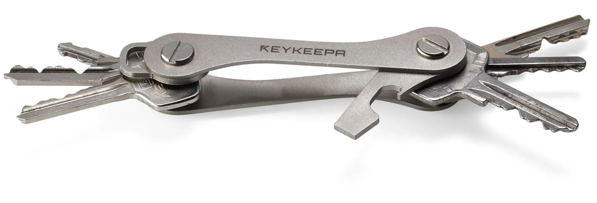 Zwischen zwei Edelstahlbacken fasst der Schlüsselorganisator bis zu 16 Schlüssel zu einem übersichtlichen Ganzen zusammen. Die Schlüssel werden einzeln eingelegt und so fixiert, dass sie sich später wie das Werkzeug eines Taschenmessers aus- und wieder einklappen lassen. Und so wird aus dem Bündel Schlüssel eine Art „Barren“, aus dem mit einem Griff der richtige Schlüssel gewählt werden kann und der zur Ordnung in der Hosentasche beiträgt (und die Taschenbeutel noch vor Beschädigung schützt).