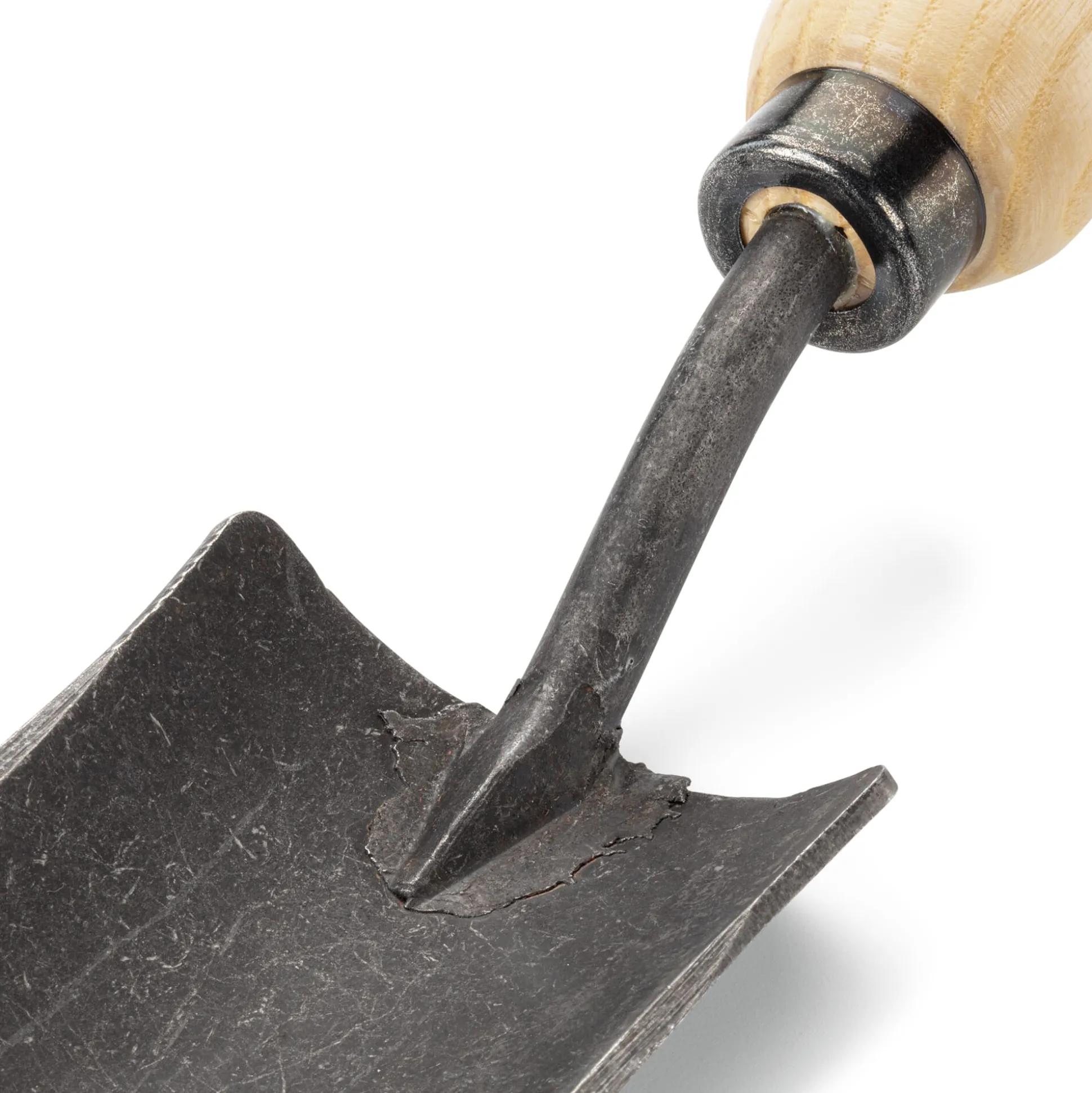 Blatt aus Mangan-Bor-Stahl geschmiedet (17 × 5,5 cm). Handgriff Eschenholz lackiert. Gesamtlänge 36 cm. Gewicht 240 g.