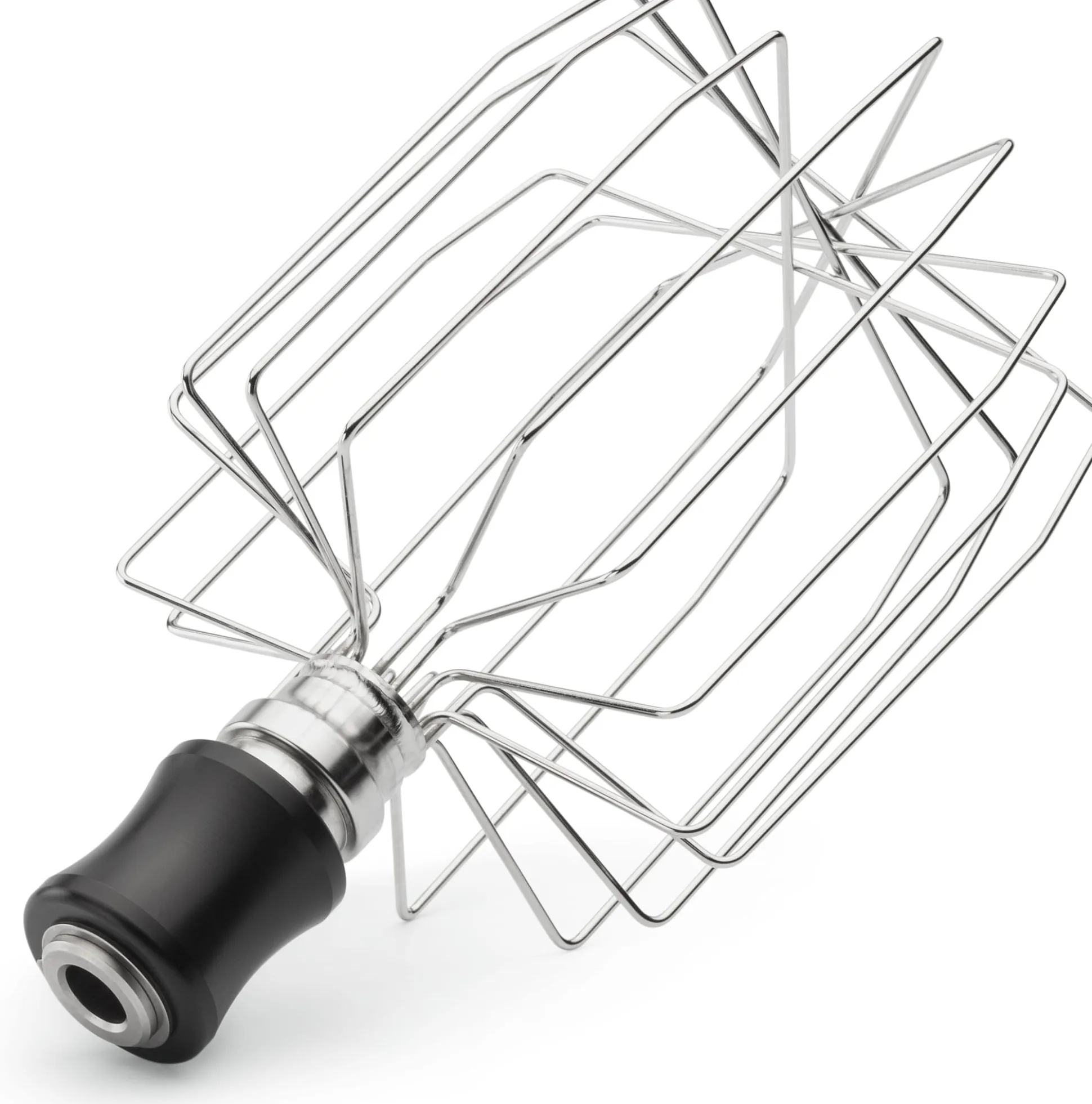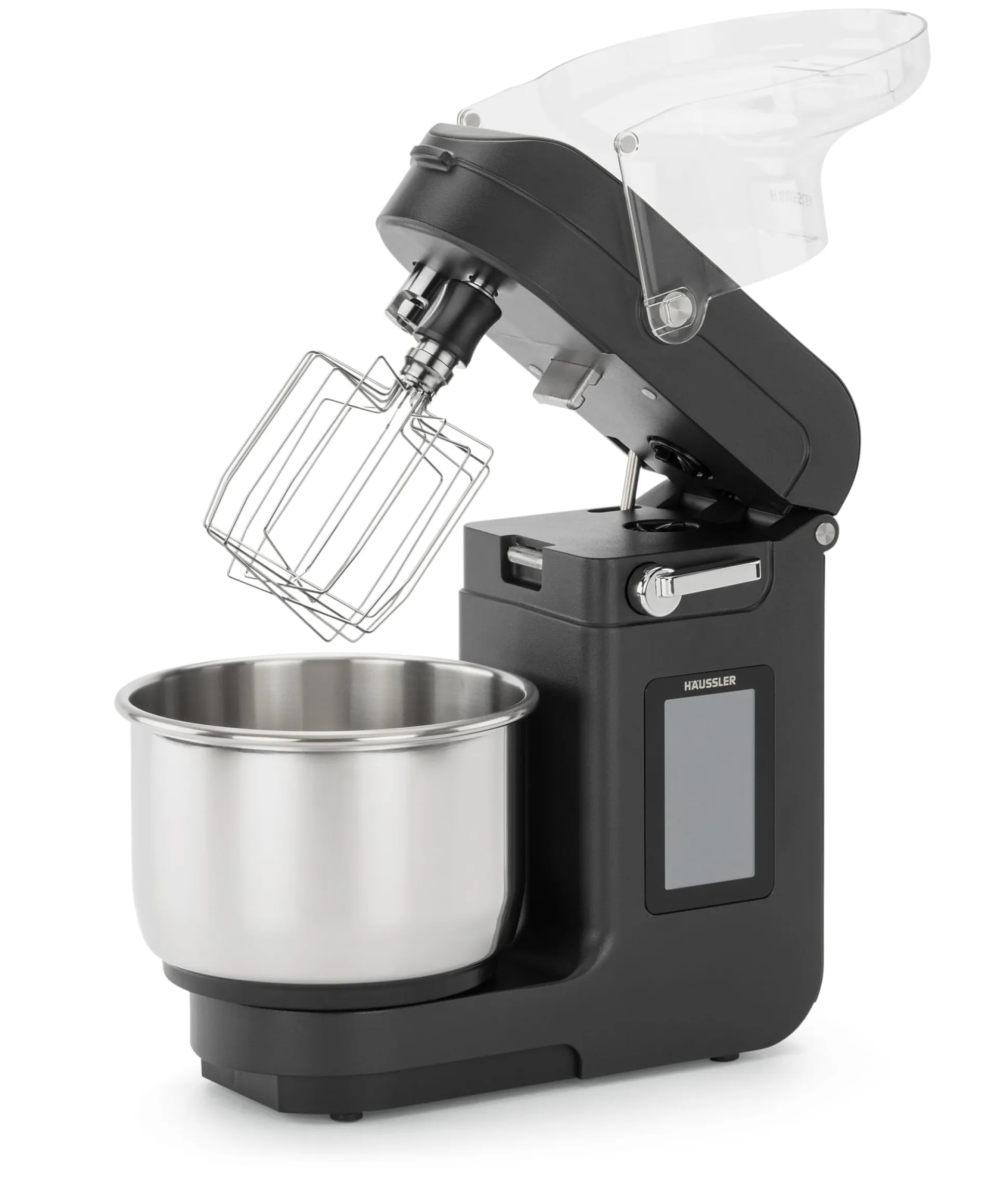 Funktionserweiterung: Der große Schneebesen mit den raffiniert geführten, kräftigen Edelstahlschlaufen verwandelt die Knetmaschine NOVA aus unserem Sortiment im Handumdrehen in ein hochkarätiges Rührgerät. Die Maschine selbst ist zu diesem Zweck mit einer gesonderten Werkzeugaufnahme mit gegenläufiger Welle ausgerüstet. So dreht sich der Schneebesen entgegen der rotierenden Rührschüssel. Biskuitteig, Eischnee und Dessertmasse profitieren von optimalen Aufschlagswerten und einem hohen Sauerstoffeintrag. Mit anderen Worten: Sie werden extra luftig und fluffig und gerade Biskuitboden geht beim Backen besonders gut auf.