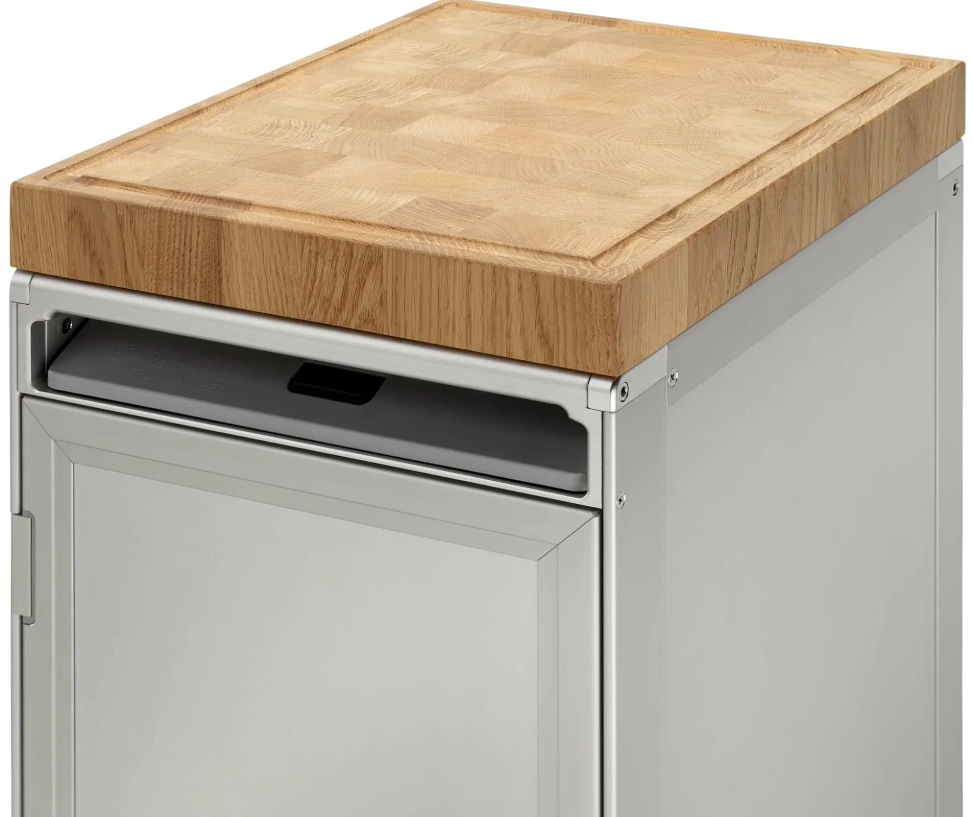 Schneiden, Hacken, Zerkleinern – das als oberer Abschluss zu den Containertrolleys aus unserem Sortiment angebotene Schneidbrett könnte robuster nicht sein, denn es besteht aus Eschenholz. Gemüse, Fleisch, Brot – kein Gut, was hier nicht gehandhabt, zubereitet, in Form gebracht werden kann. Es passt formschlüssig in die obere Ablage der Container unterschiedlicher Typen und macht dieses ungewöhnliche Stauraummöbel zu einem ernsthaften Arbeitsgerät in der Küche.