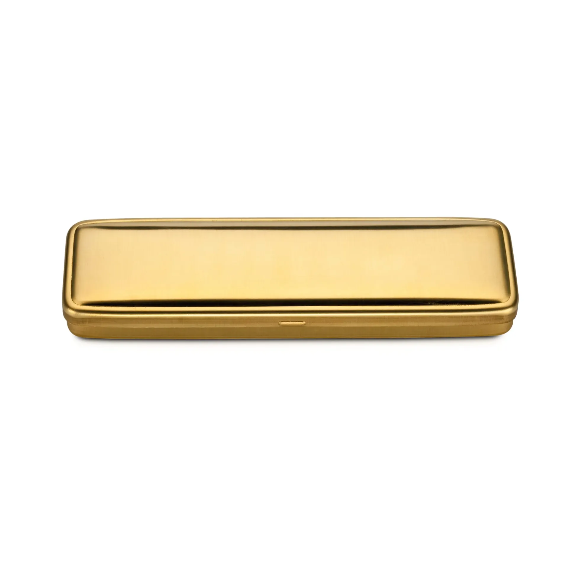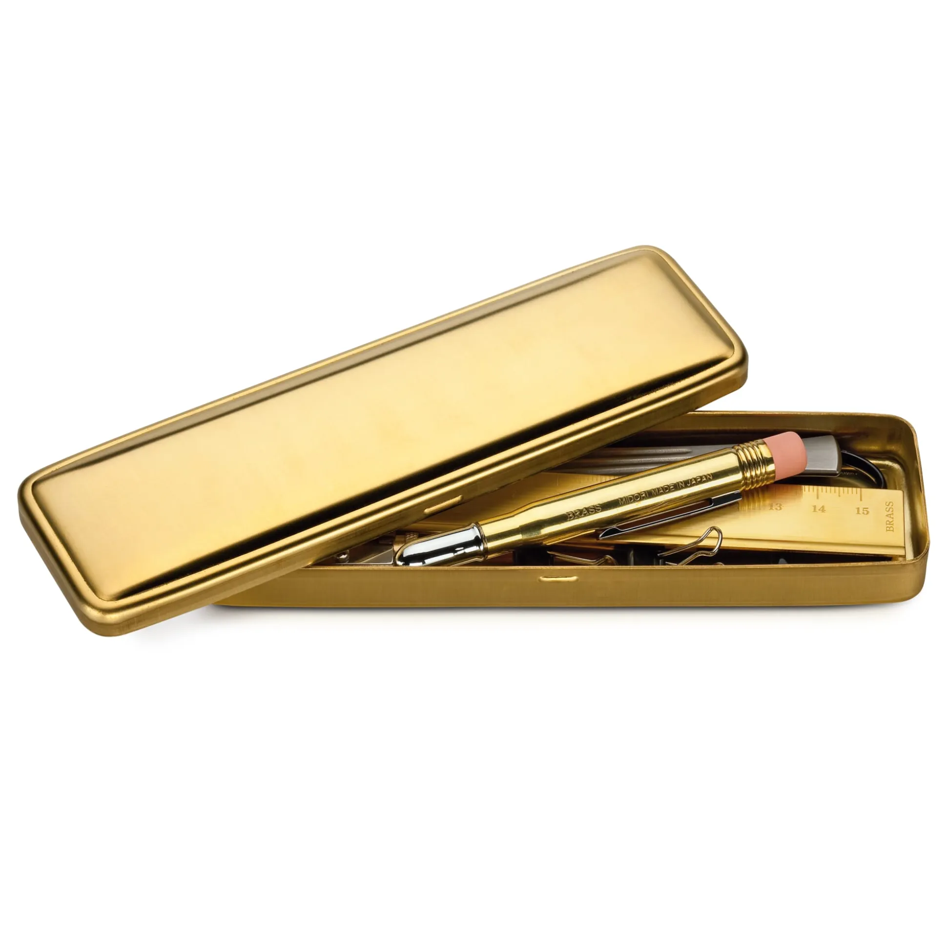 Dieses zweiteilige, ordentlich schwere Stülpdeckeletui aus Messing ist ganz auf den Schutz seines Inhalts und eine lange Lebensdauer ausgelegt. Der äußeren Form nach erinnert es an die metallenen Zubehörkästchen, wie sie früher zumeist mit der Nähmaschine ins Haus kamen und in denen man aufbewahrte, was zum Nähen gebraucht wurde (Nadeln, Garnrollen, Nähmaß). In unserem Etui lässt sich also aufbewahren, was an Schreibwerkzeug (zum Schreiben mit der Hand) benötigt wird.