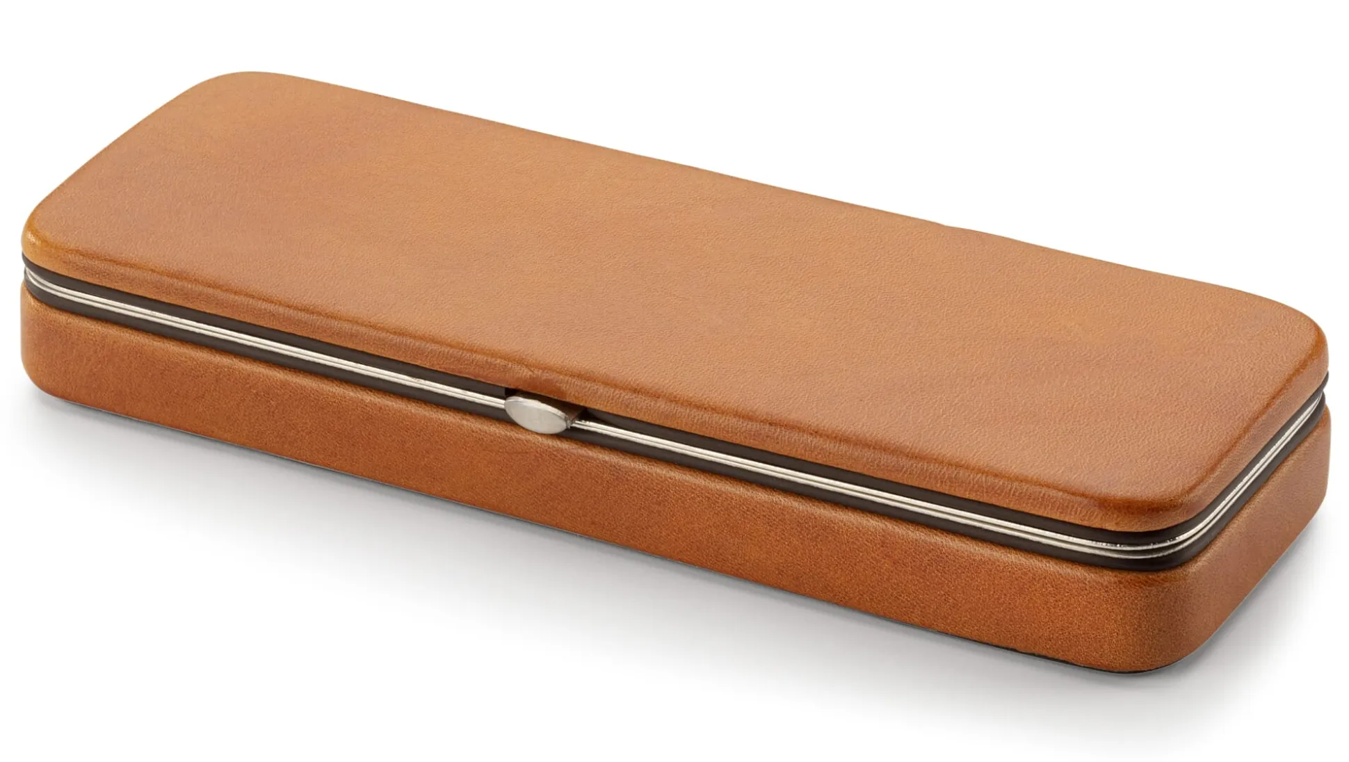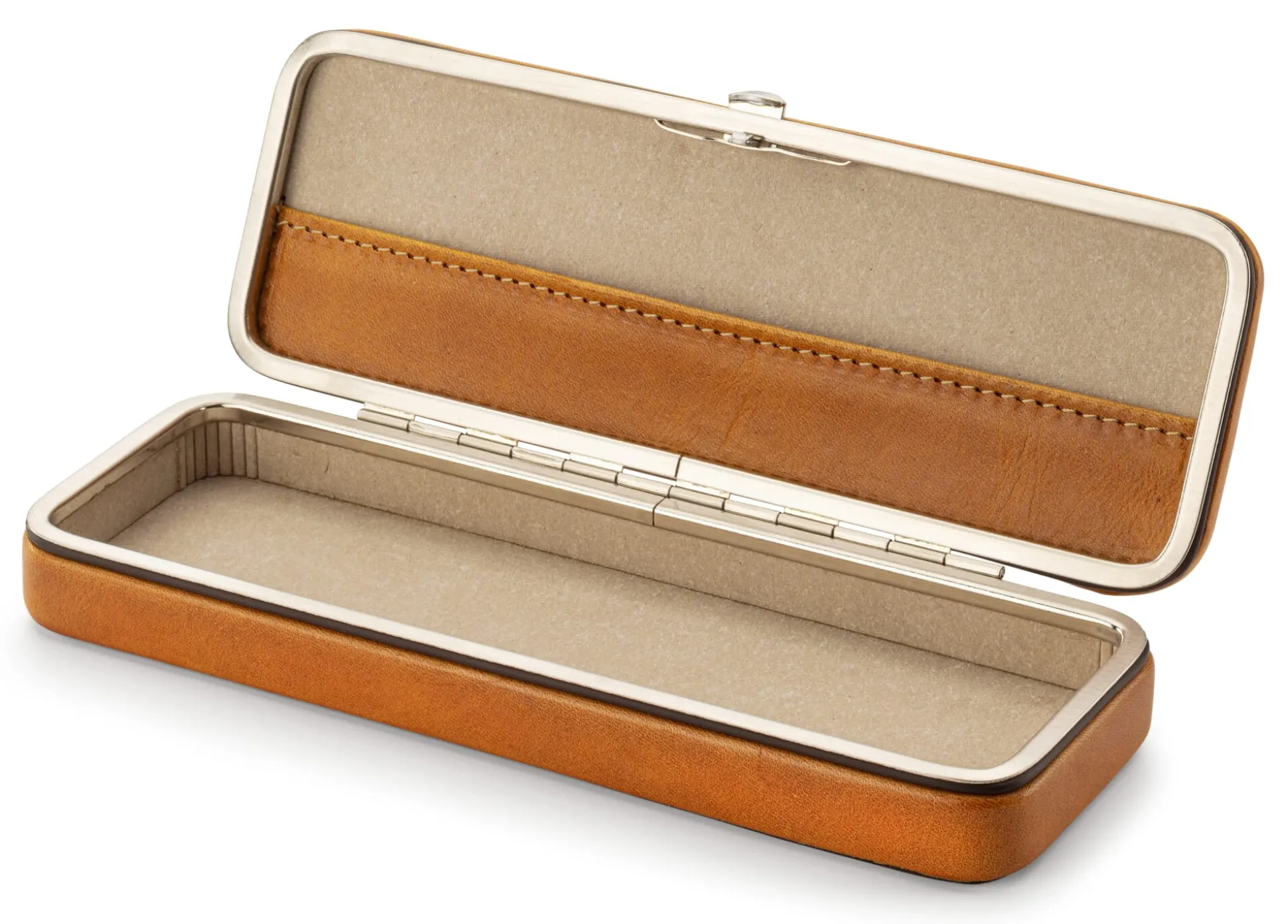 Kompakt, strapazierbar und stabil ist dieses ansehnliche wie haptisch angenehme Schreibetui und schützt so unterwegs Ihre Schreibgeräte. Das vegetabil gegerbte Rindleder bildet im Verein mit dem vernickelten Stahlrahmen eine standhafte Box, die die darin verstauten Füllfederhalter, Kugelschreiber oder Bleistifte vor Stößen und mechanischer Einwirkung in Akten-, Laptop- oder Reisetasche bewahrt. Ein schmales Steckfach im Deckel bietet Platz für die eine oder andere Visitenkarte, für Belege oder Notizzettel. Innen ist das Schreibetui mit widerstandsfähigem Lefa ausgeschlagen, einem ressourcenschonend aus Lederresten und Naturlatex hergestellten Material.