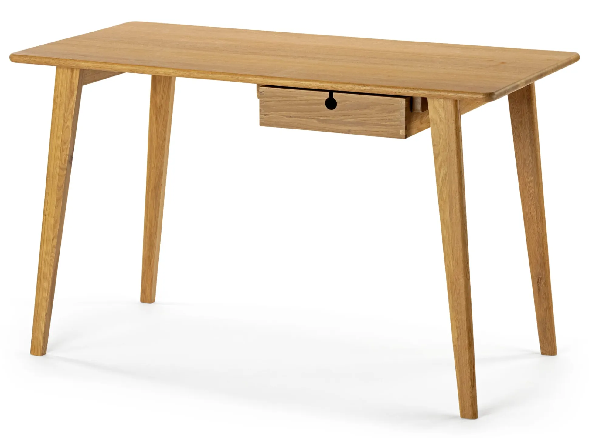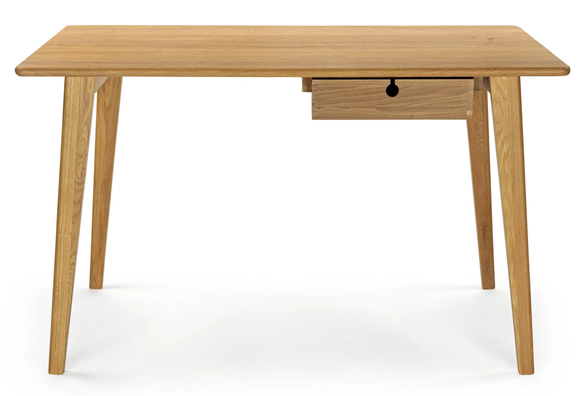 2020 von Johannes Foersom und Peter Hiort-Lorenzen entworfen, gehört der vielseitige, nur 1,20 m breite Schreibtisch zu den jüngeren Möbeln von FDB Møbler. Seine Konstruktion zeichnet sich neben der flexibel platzierbaren Schublade durch eine weitere Besonderheit aus: Er wird aus massivem, klar lackiertem Eichenholz hergestellt und kommt dabei ohne Holzwerkstoffe und mit Ausnahme der Schraubverbindungen ganz ohne Beschläge aus. Die Platte ist aus massiven, durchgehenden Eichenholzleisten gemacht, die Schublade mit gezinkten Kanten wird auf Holzleisten geführt.