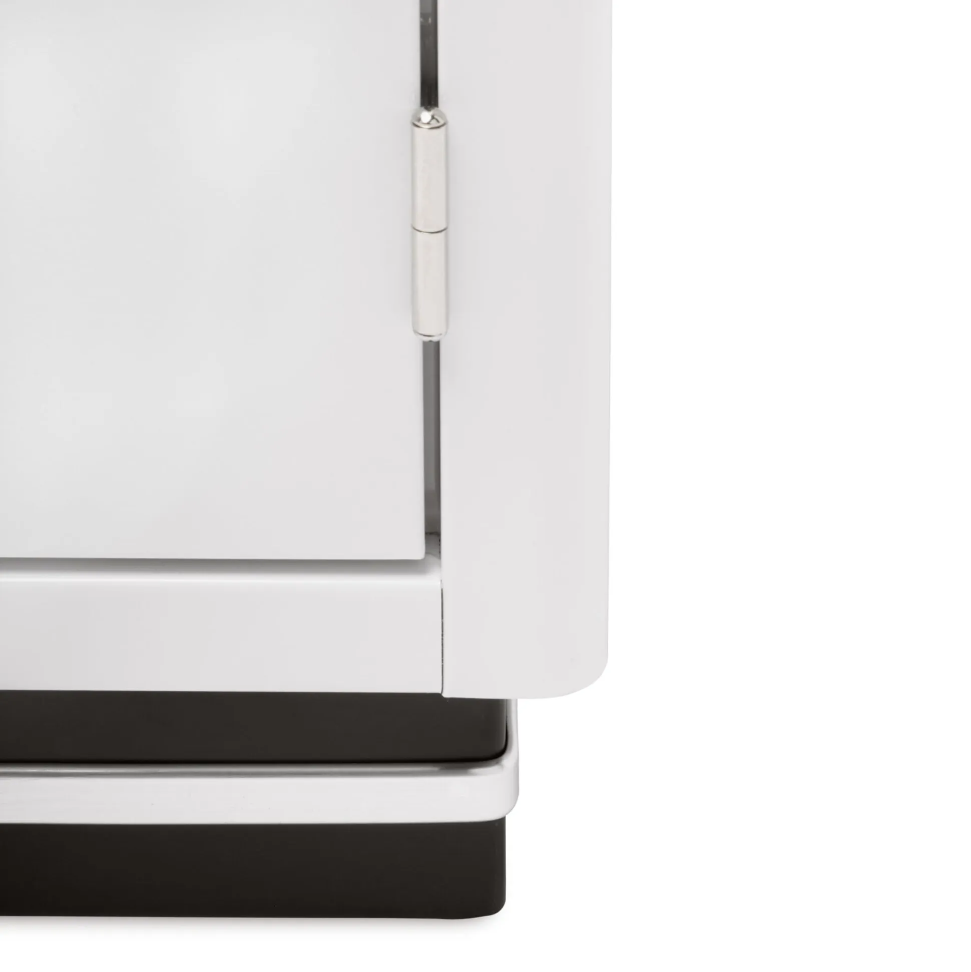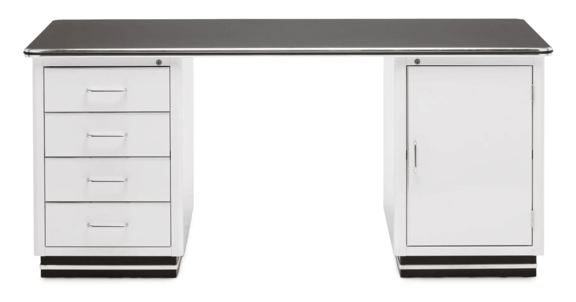 Stahlblech lackiert. Arbeitsfläche aus Tischlerplatte, linoleumbelegt. Farbe Weiß, Tischfläche schwarz. Ein Container mit vier kugelgelagerten Schüben, zentral verriegelbar, ein Container mit abschließbarer Tür und einem Einlegeboden. Hergestellt in Deutschland.