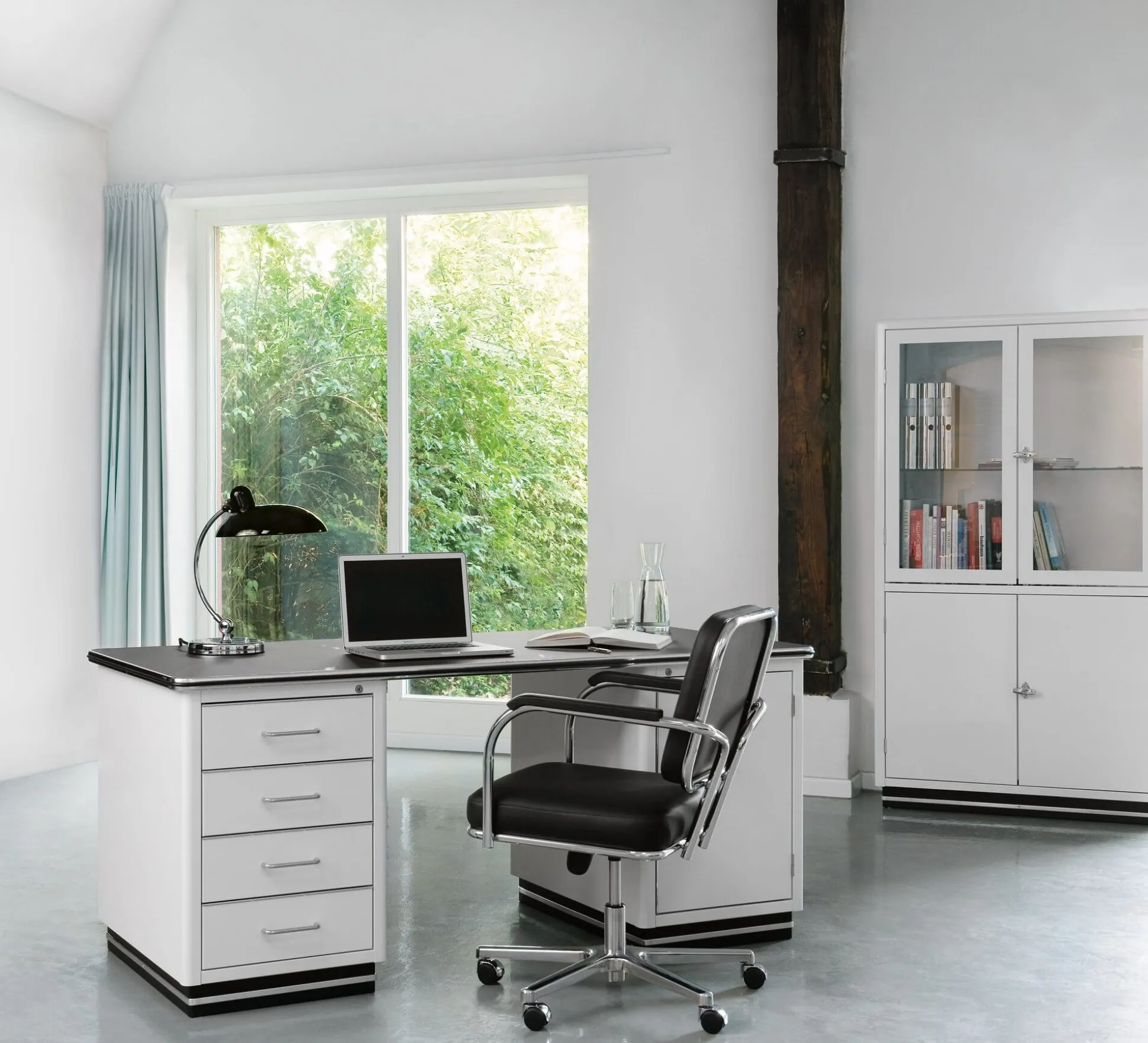 Unübersehbar, dass den Müllerschen Schreibtischen trotz ihrer Abstammung aus Arztpraxis und Krankenhaus nichts Klinisches mehr innewohnt. Vielmehr bestechen sie durch ihr nüchternes Erscheinungsbild – und gerade weil sie gestalterisch so zurückhaltend sind, passen sie als ansehnliches, durchaus auch repräsentatives Arbeitszentrum in ganz unterschiedliche Einrichtungsstile. Gleichwohl sind sie Zweckmöbel, die Sie Ihren Bedürfnissen entsprechend noch weiter anpassen können: Die Farbe und Ausstattung der Container sind ebenso wie die Farbe und Größe der Schreibplatte variabel – und zwar nicht zwangsläufig gegen Aufpreis.