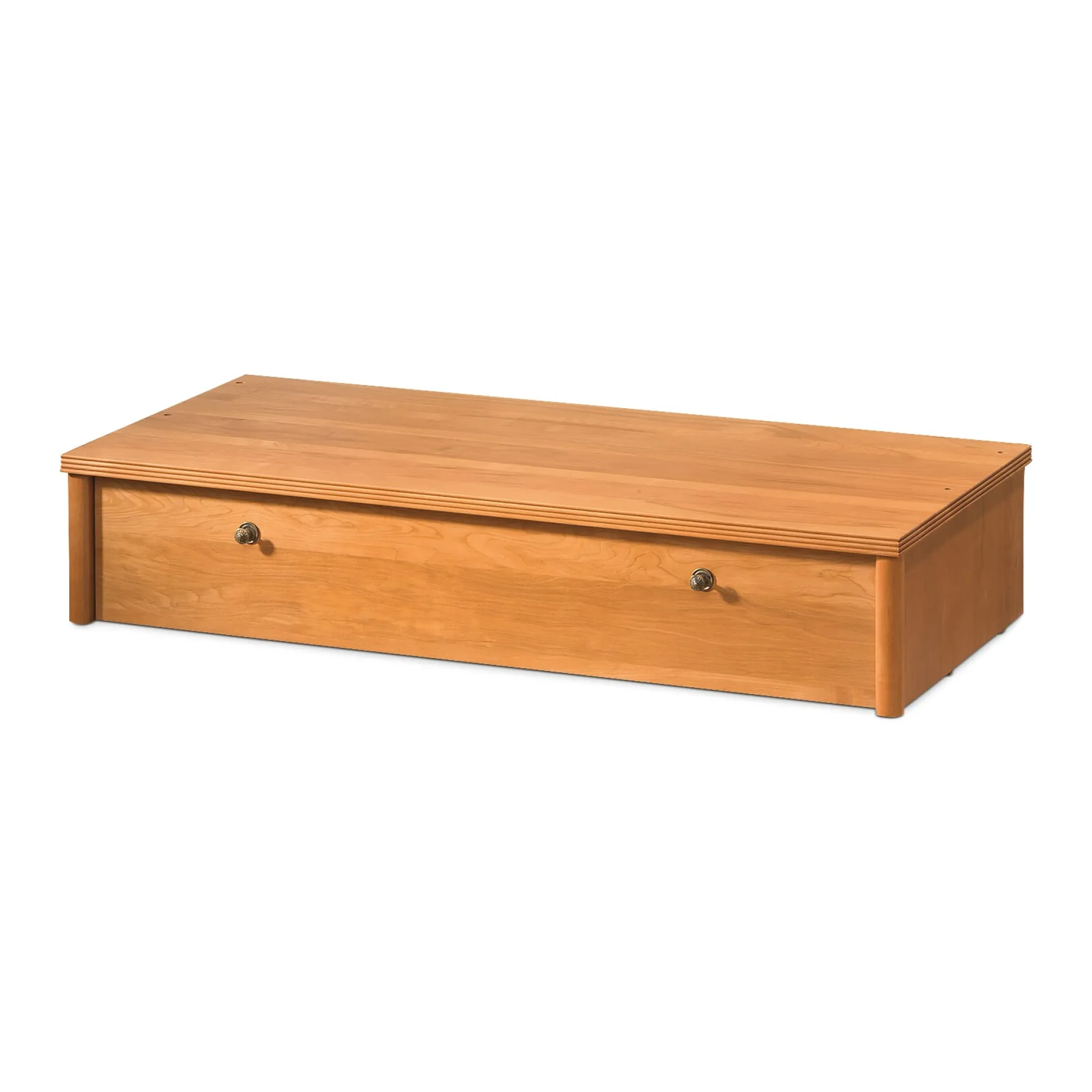 Front massive Feuerlandkirsche, Seitenwände und Böden furniertes, gebeiztes Buchensperrholz. Leichtgängiger Auszug auf Metallschienen.