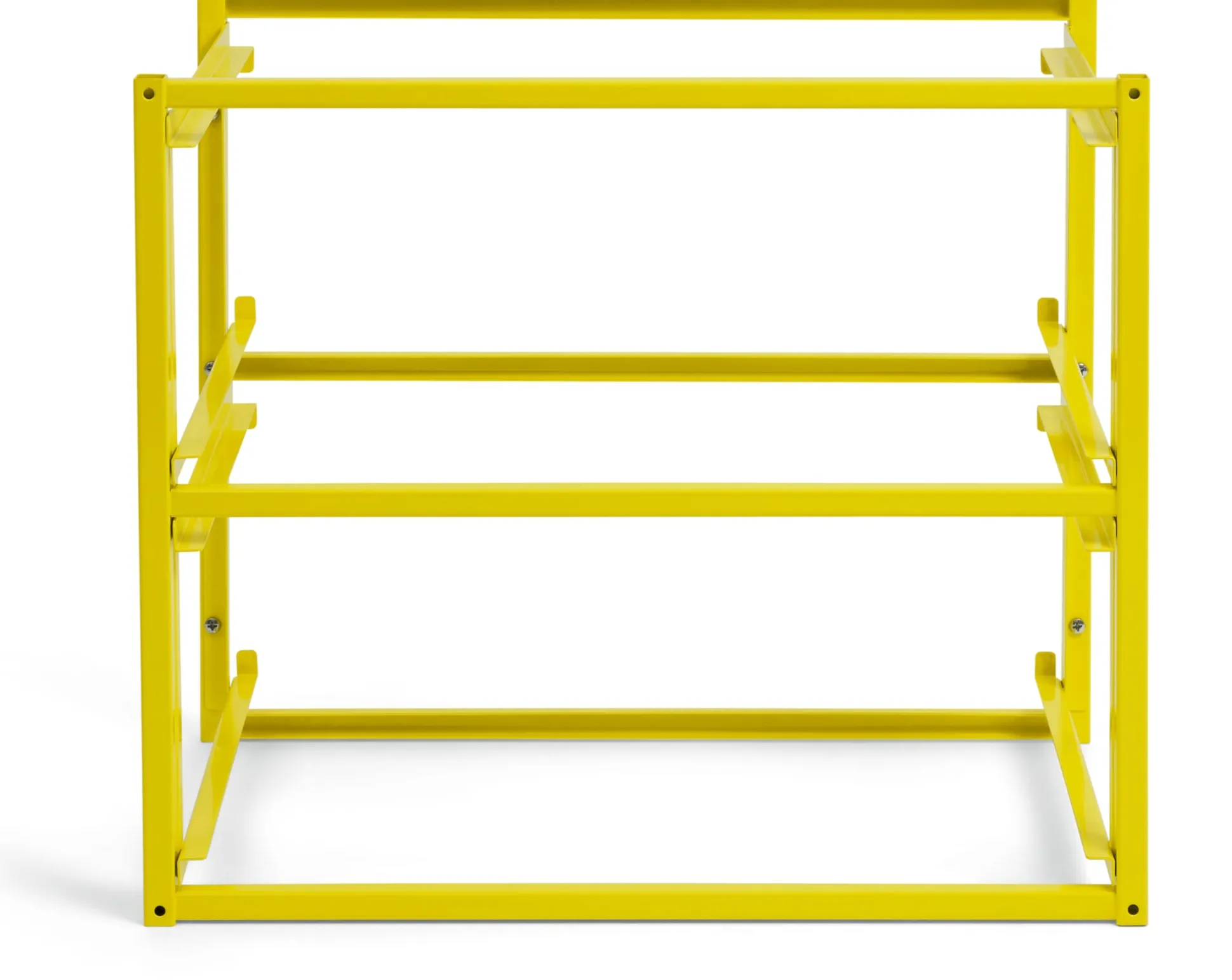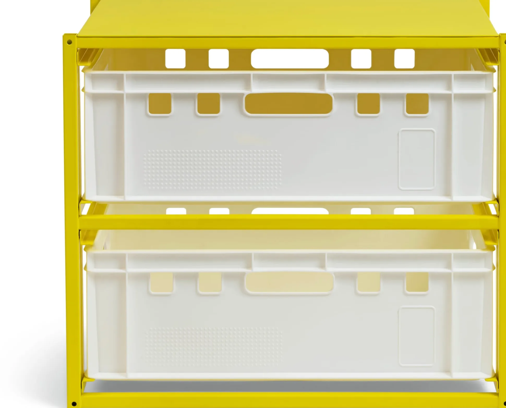 STELLAGE ZWEI macht den tausendfach in der Lagerlogistik und im Transportwesen genutzten Eurobehälter zum Staumöbel und bringt seine idealen Proportionen und dienstbaren Eigenschaften in den Wohnbereich: Als Schubladen lassen sich die praktischen Systemkisten passgenau in das Stahlgestell einschieben und erfüllen als Schubladenregal vielfältige Aufgaben: als Vorratsmöbel in der Küche, als Stauraum für Wäsche und Kleidung, für Papier und Bürokram im Arbeitsraum oder als Lagerregal im Hauswirtschaftsraum. Die Regalelemente sind aus pulverbeschichtetem Stahl gefertigt, bieten Platz für je zwei Kisten und lassen sich mithilfe der mitgelieferten Verbinder mit Federmechanik übereinanderstapeln – zu niedrigen Kommoden bis hin zu hohen Wandregalen.