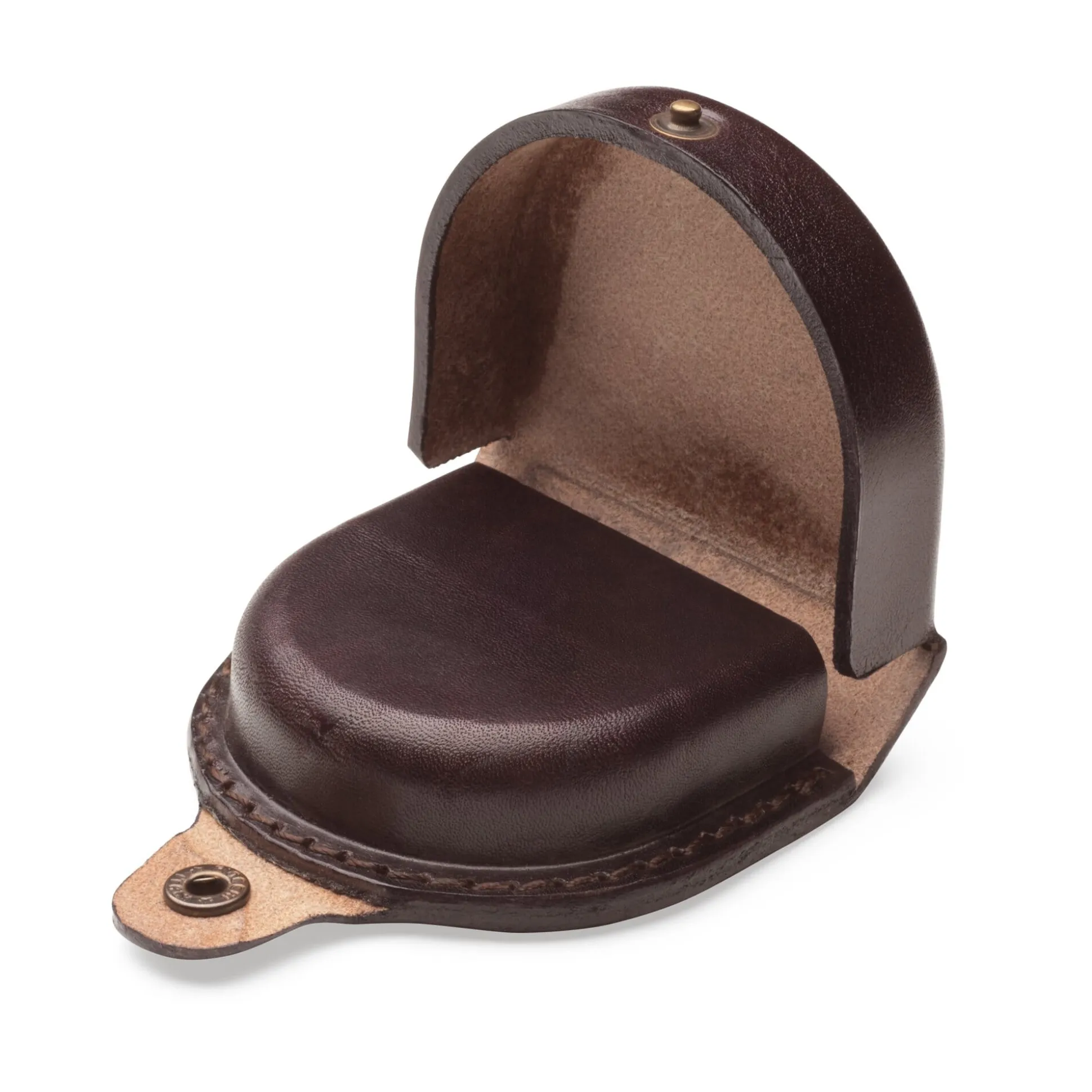 Rindleder, vegetabil gegerbt (Stärke des Rahmens 3,6 mm, des Bodens 2,4 mm), offenkantig in Sattlertechnik vernäht. Druckknopfverschluss. Hergestellt in Ungarn.