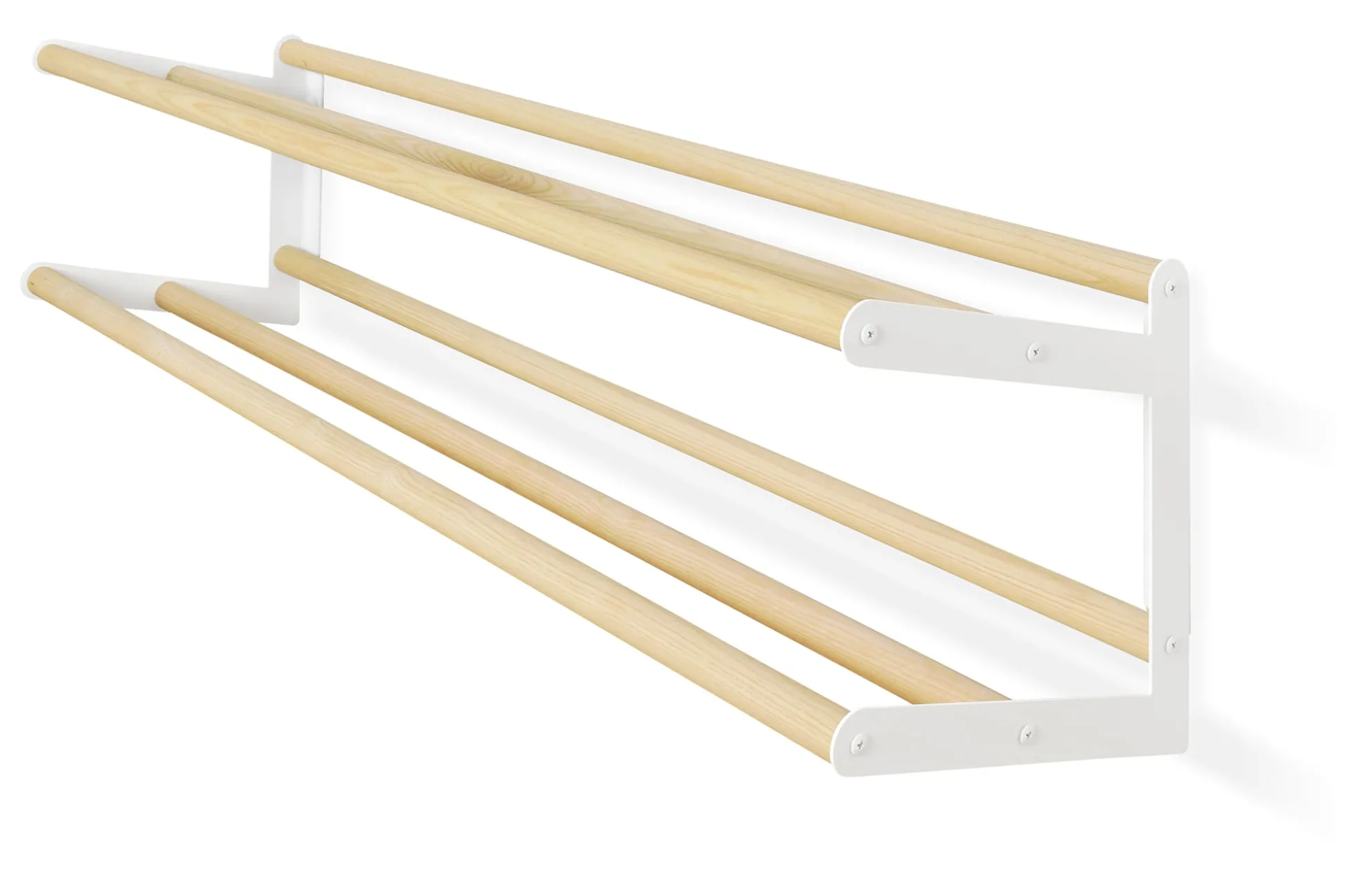 Das Schuhregal STIXX zur Wandmontage. Gefertigt aus Eschenholzstäben und Verbindungselementen aus Stahlblech, trägt das demontiert gelieferte und mit wenig Aufwand zu montierende Regal bis zu vier Paar Damen- wie Herrenschuhe je Stangenpaar. Das Zubehör zur Wandmontage gehört zum Lieferumfang.