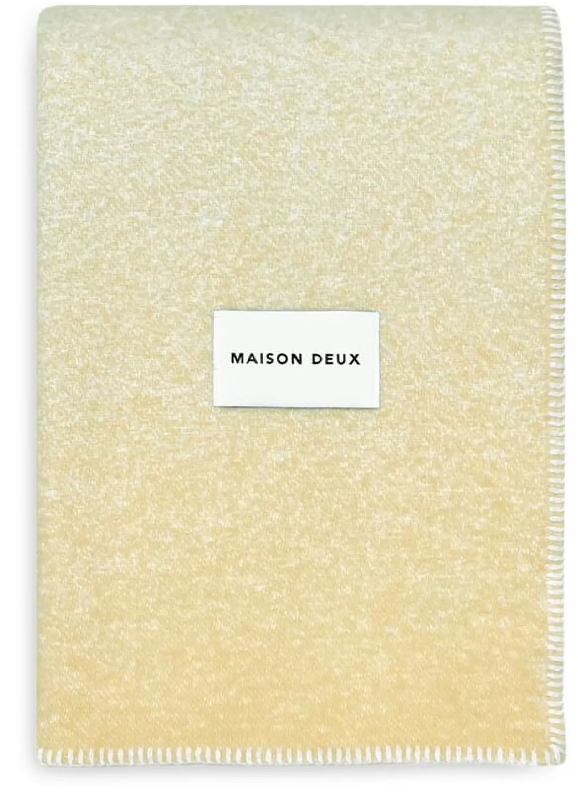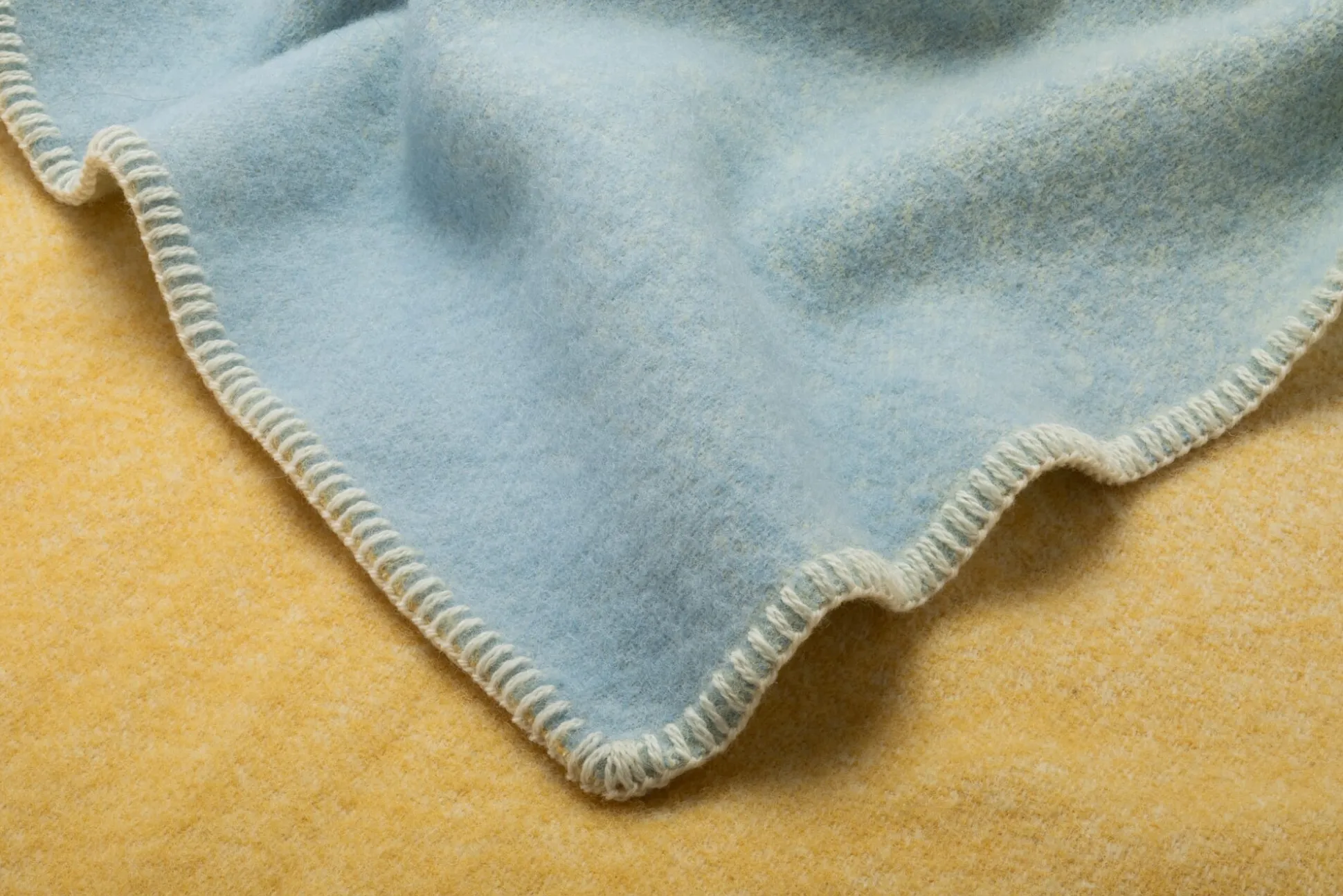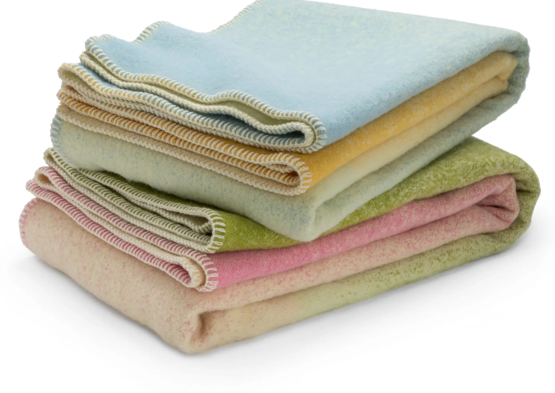 Griffig, weich und voluminös – mit diesen Decken aus neuseeländischer Schurwolle haben Sie es nicht nur warm, sondern auch farbenfroh auf dem Sofa. Die Wolldecken werden auf Jacquardwebstühlen gewebt, das erlaubt doppeltes Spiel mit den Farben: Auf der einen Seite nimmt die Farbintensität zur Mitte hin zu, wo Blau und Gelb beziehungsweise Rosa und Grün kontrastierend aufeinandertreffen. Auf der anderen Seite nimmt die Intensität der Farben zur Mitte hin ab. Sie haben also die Wahl, ob sich die Decke mit farbstarkem Akzent oder sanftem Farbverlauf präsentieren soll, wenn Sie darunter Ihren Nachmittagsschlummer halten. Dank ihrer Größe von 130 × 200 Zentimetern ist die Decke dafür wie gemacht. Unempfindlich und strapazierbar, eignet sie sich jedoch ebensogut für die kühlen Abendstunden im Garten und auf der Terrasse. Die Kanten sind mit einem festen Kettelstich in naturfarbenem Wollgarn versehen, der für Formtreue sorgt.