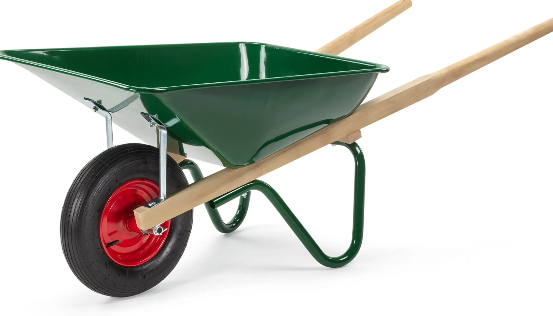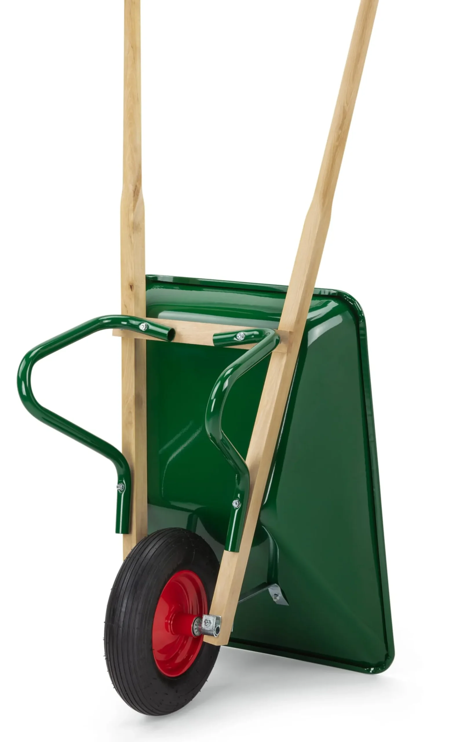 Luftgefülltes Rad mit Stahlfelge und Kugellager (Ø 40 cm, Breite 9 cm). Untergestell und Wanne (L 86 × B 66 × H 26 cm) aus Stahl, grün pulverbeschichtet. Griffe Buchenholz (Herkunft Polen). Hergestellt in Schweden. Volumen max. 90 l, Belastbarkeit max. 150 kg. Gesamtmaße 151 × 66,5 × 63 cm. Gewicht 16,5 kg.