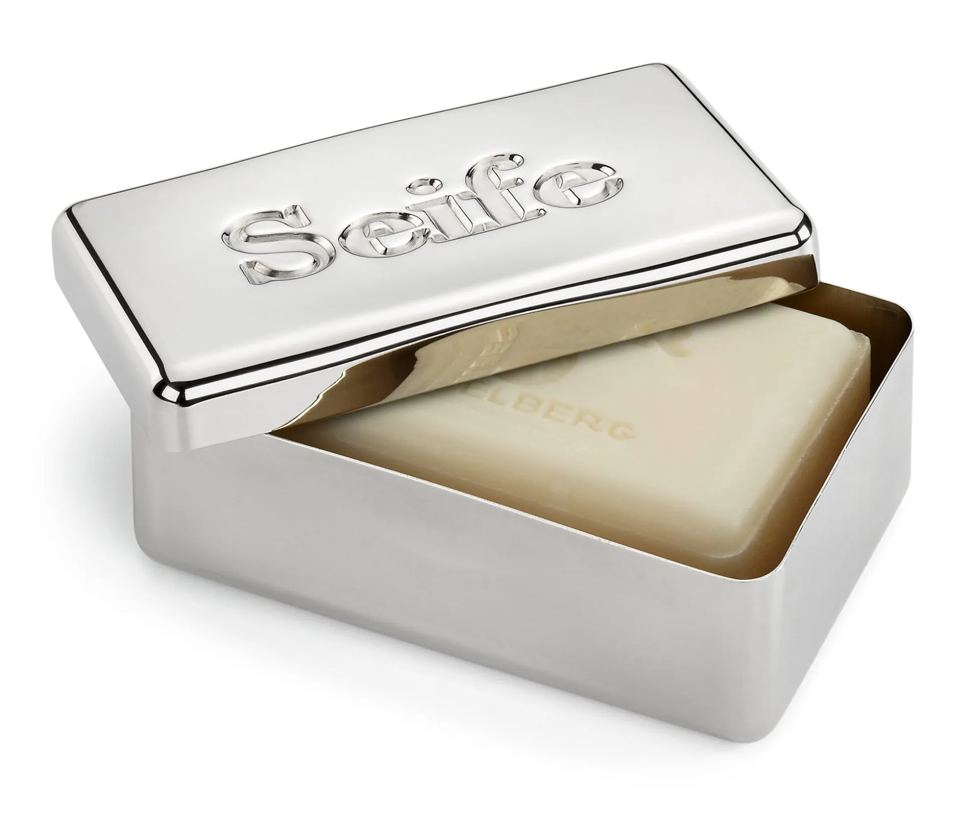 Seifendose aus Neusilber (einer Legierung aus Kupfer, Nickel und Zink), poliert. Hergestellt in Deutschland. 9,1 × 5,6 × 3,4 cm. Innenmaß 8,5 × 5,4 × 3 cm. Gewicht 80 g. Lieferung ohne Seife.
