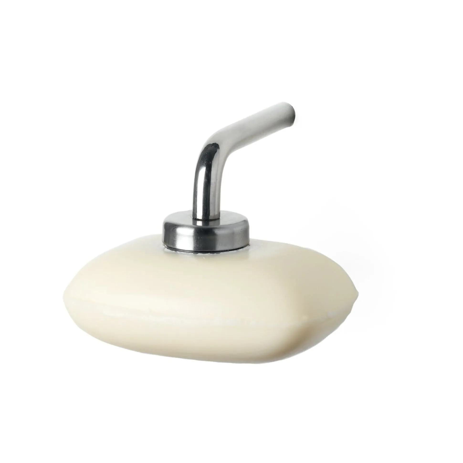 Eine in Form und Materialaufwand auf das Notwendigste reduzierte, fast asketische Badezimmerserie aus Edelstahl. Magnetischer Seifenhalter mit einem rostfreien Seifenplättchen. Die Schraube für die Wandmontage sitzt im Ende der Stange.