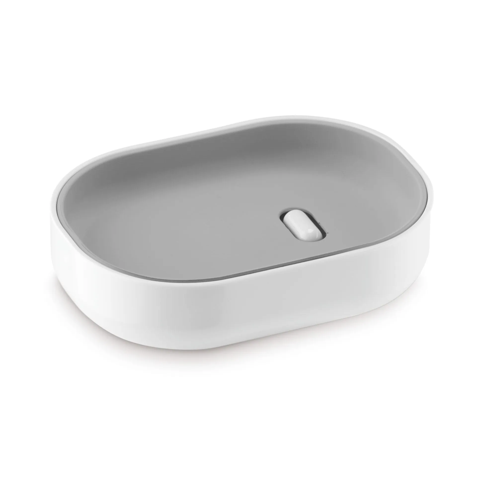 Formatgerecht und zweiteilig, mit Unterschale und abnehmbarer Oberschale. Die Seife liegt auf einem sich aus dem unteren Schalenteil entwickelnden Kunststeg leicht schräg, was ihr Trocknen ermöglicht.