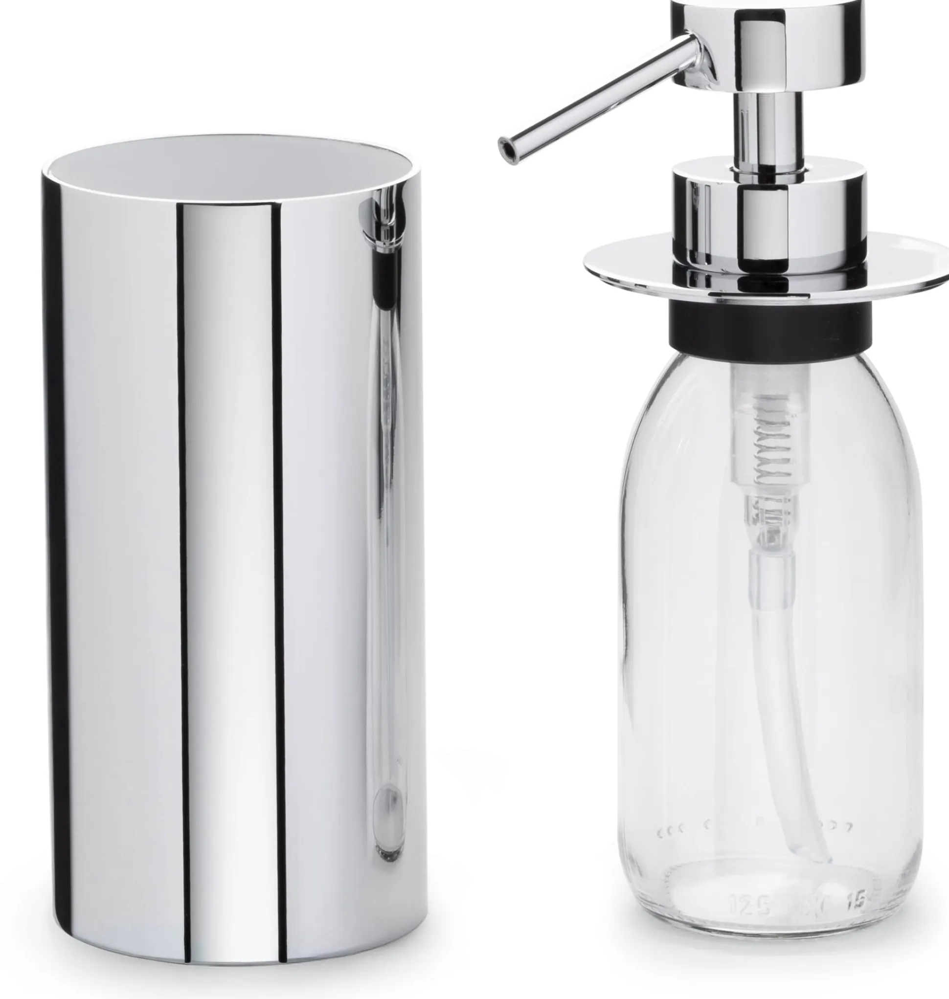 Seifenspender und Pumpe aus verchromtem Messing. Seifentank aus Pressglas, klar. Saugschlauch aus Kunststoff. Volumen 140 ml. Höhe 16 cm, Ø 6 cm. Gewicht 590 g. Lieferung ohne Seife.