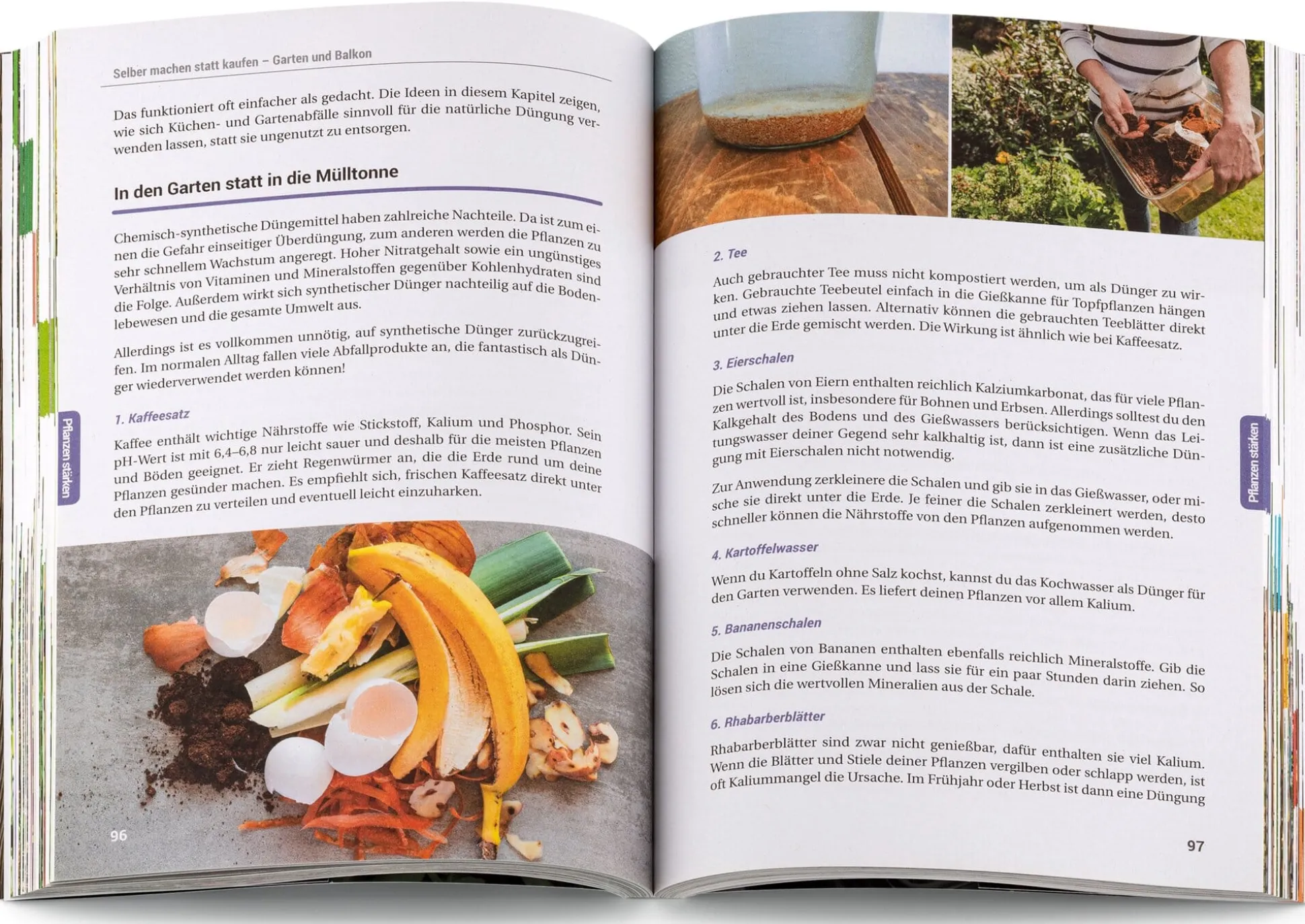Baut man seine Lebensmittel im eigenen Garten an, ist es wichtig, die richtige Fruchtfolge zu beachten, um die Entwicklung der Pflanzen zu fördern und gute Erträge zu erzielen. Abfälle wie Eierschalen, Rhabarberblätter oder Bananenschalen sorgen für die Versorgung des Bodens mit Mineralstoffen. Gegen Pflanzenkrankheiten und -schädlinge helfen Wildkräuter wie Wermut, Brennnessel, Schachtelhalm und Löwenzahn, die – als Jauche, Auszug oder Brühe angesetzt – auf natürliche Weise für gesundes Wachstum sorgen. So haben Sie die Qualität der Lebensmittel selbst in der Hand und können zusätzlich noch Geld sparen. Zudem kommt die naturnahe Grünfläche der Umwelt zugute sowie zahlreichen Gartenbewohnern wie Bienen, Schmetterlingen, Vögeln und anderen Nützlingen.