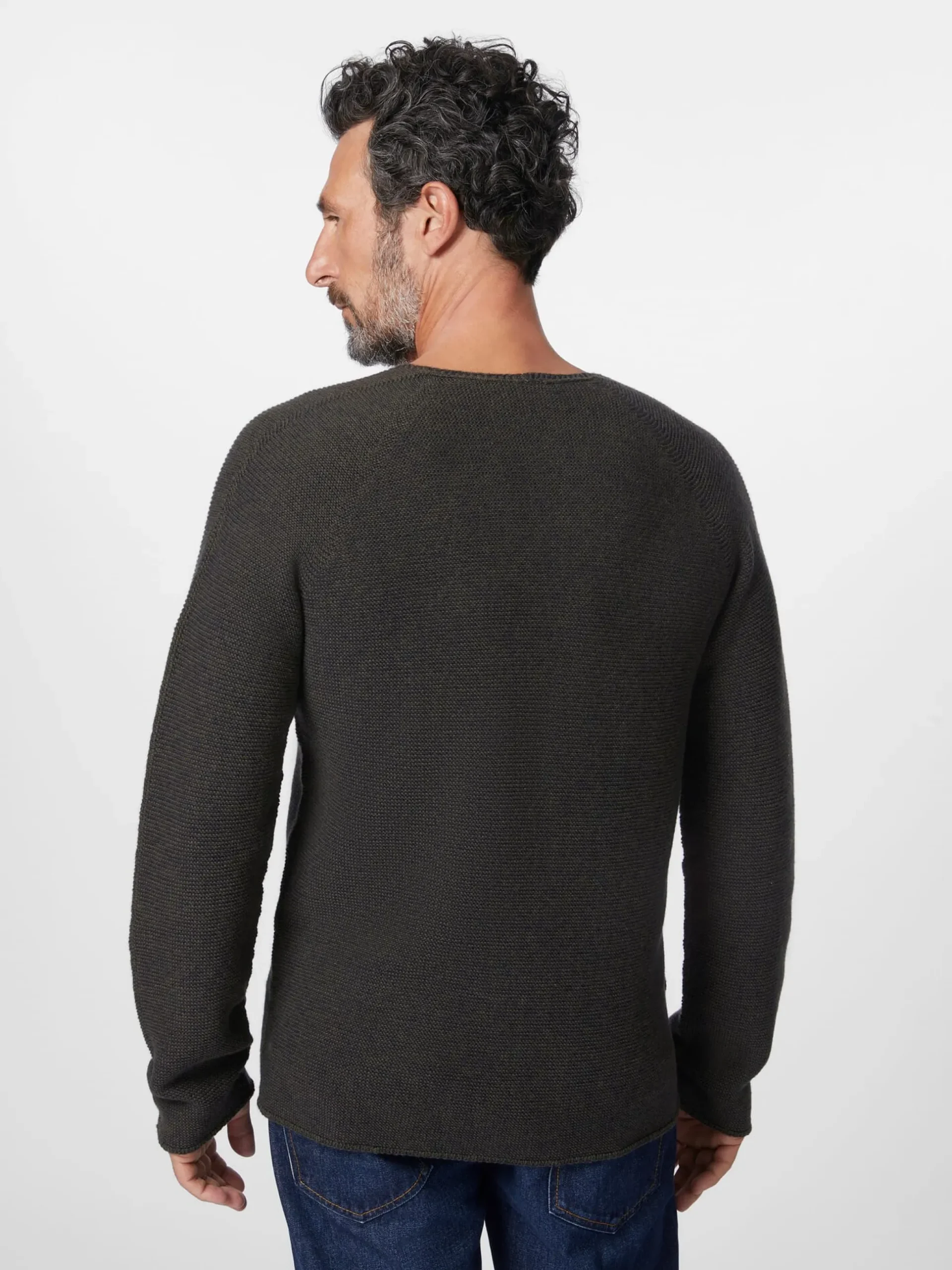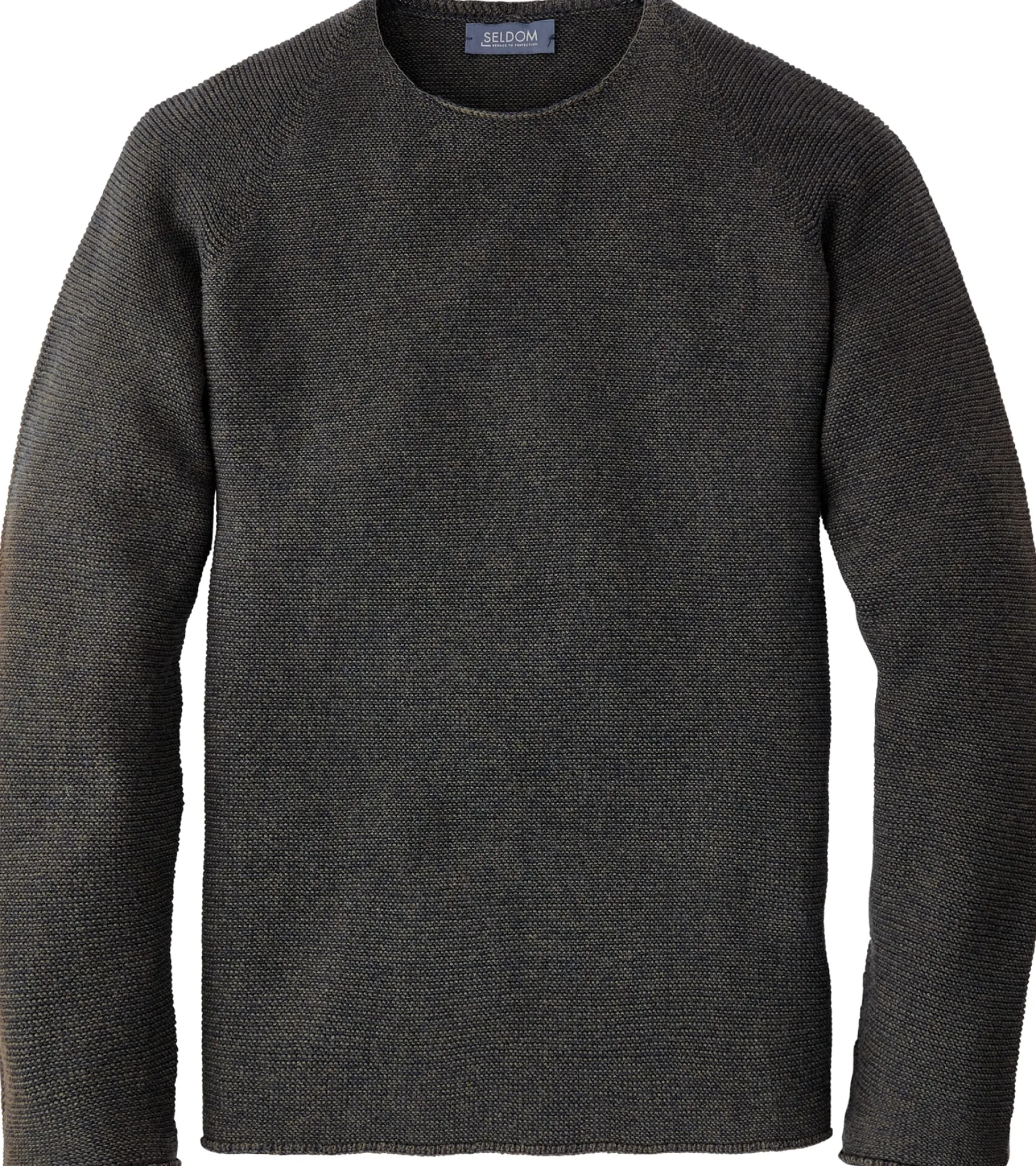 Für diesen Rundhalspullover in breiter Rippenoptik verwendet Seldom Garne aus einer kleinen Spinnerei in Norditalien, die in dieser Qualität exklusiv für den Westerwälder Strickspezialisten hergestellt werden. Zu ihrer Herstellung wird langstapelige kbT-Merinowolle im Streichgarnverfahren gesponnen. Das patentierte Spinnverfahren sorgt dafür, dass der Pullover kaum Pilling-Neigung besitzt. Durch das Links-links-gestrickte Verfahren mit zwei unterschiedlichen Farben entsteht der besondere Melangeton. Am hinteren Kragen ist ein Bündchen eingesetzt.