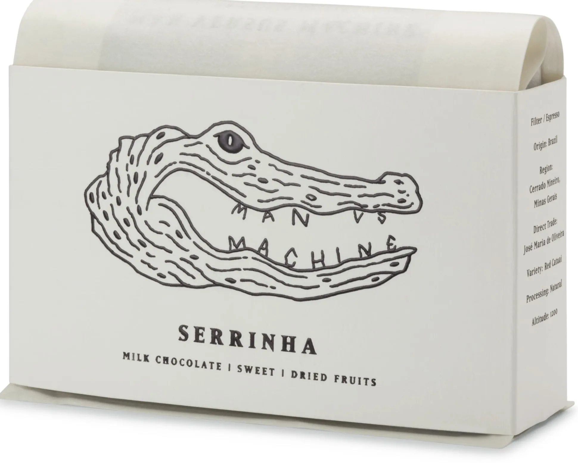 Die Bohnen für den Serrinha stammen aus der Region Cerrado Mineiro im Südosten Brasiliens. Cerrado Mineiro liefert einige der besten Kaffees des Landes. Das liegt nicht zuletzt an den mineralreichen Böden und der Klimagunst: Die Temperaturen sind das ganze Jahr über relativ hoch, während die Niederschlagsmenge von November bis März am höchsten ist. Man versus Machine verwendet für den Serrinha Kaffeebohnen der Sorte Red Catuai von der Farm von José Maria de Oliveira. Der Serrinha zeichnet sich durch einen vollmundigen Geschmack, eine ausgewogene Säure und ein intensives Aroma aus. Dabei präsentiert er süße Nuancen sowie Geschmacksnoten von Milchschokolade und Trockenfrüchten.