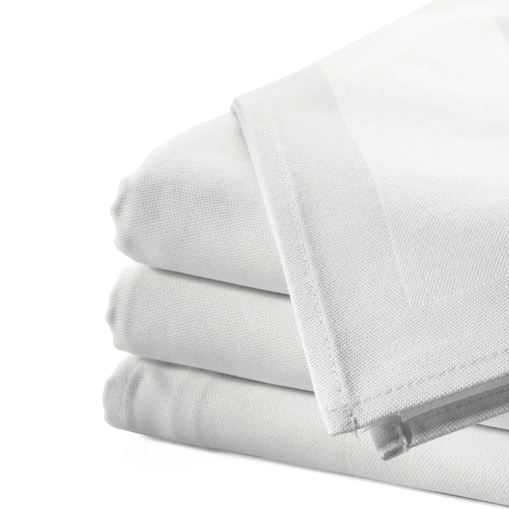Stoffservietten in Gastronomiequalität – reinweiß, griffig, unverwüstlich und natürlich kochfest. Aus merzerisierter Baumwolle und mit Atlaskante verarbeitet – jedem Papiertuch himmelhoch überlegen.