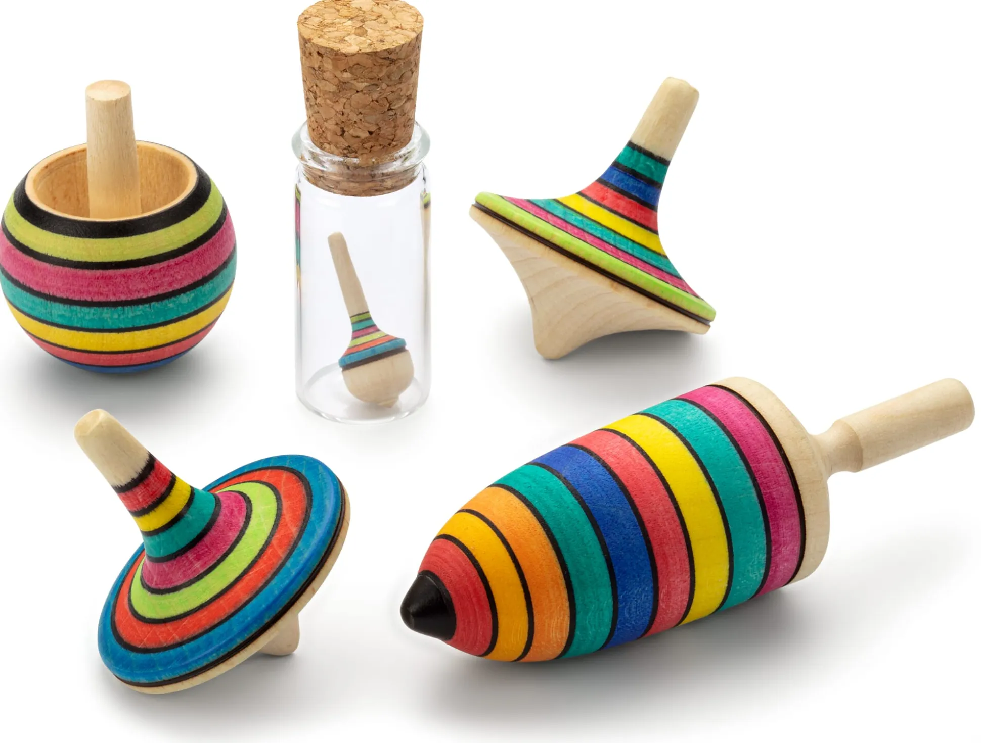 Minikreisel: Höhe 2,4 cm, Ø 0,9 cm. Gewicht 0,5 g. In einem Gläschen mit Korkstopfen.