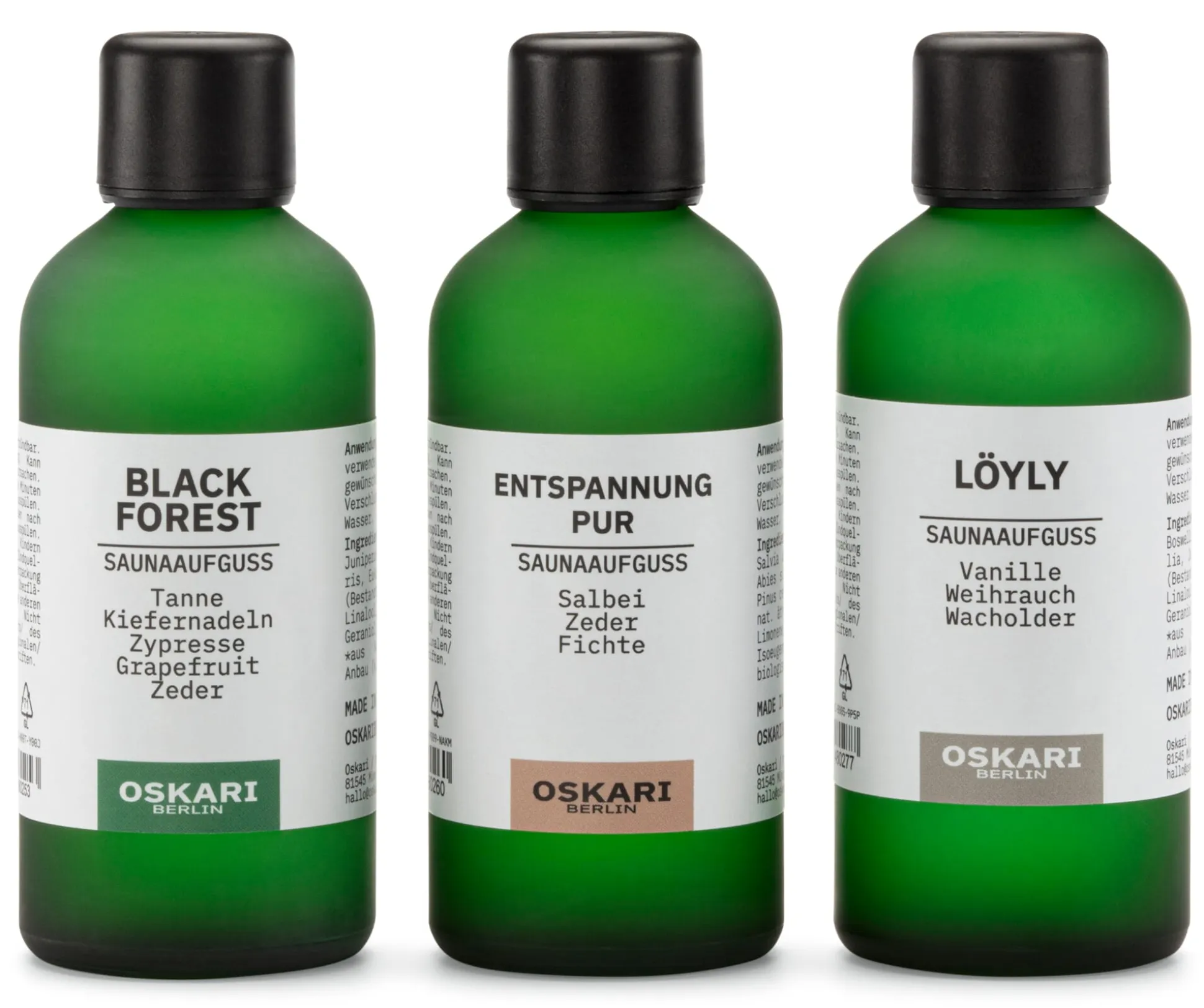 Die Natur hält ein breites Spektrum an Heilpflanzen bereit, deren wirksame Essenzen und ätherische Öle der Mensch seit Jahrtausenden einzusetzen weiß. Die Anwendungsformen sind dabei so mannigfaltig wie die Pflanzen: als reine Essenz, als Tee, Salbe oder Paste. Einem Aufguss in der Sauna zugefügt, können die ätherischen Öle ihr intensives Aroma besonders gut entfalten und je nach Kombination der Öle anregend oder beruhigend wirken. Oskari Berlin verwendet für seine Saunaaufgüsse ausschließlich naturreine ätherische Öle. Die Duftkombinationen der einzelnen Aufgüsse folgen den Erkenntnissen der Aromatherapie und verstärken so noch die wohltuende Wirkung der ätherischen Öle. In diesem Sauna-Set sind drei Saunakonzentrate zusammengestellt für erholsam-entspannende Saunaaufgüsse und abwechslungsreiche Dufterlebnisse.