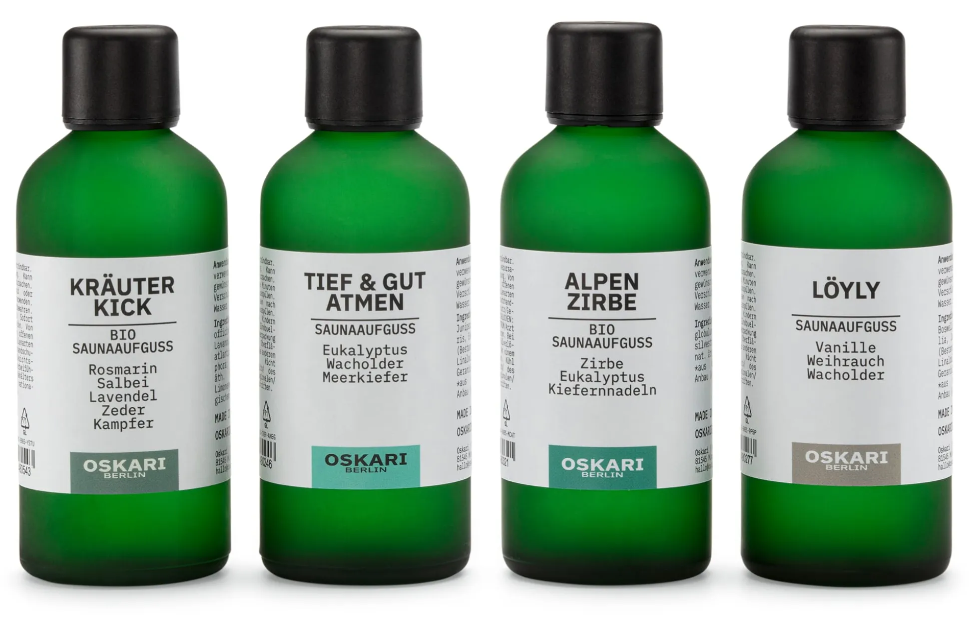 Die Berliner Manufaktur Oskari fertigt natürliche Saunakonzentrate aus naturreinen ätherischen Ölen – ganz ohne künstliche Zusätze. Dieses Set mit Saunaaufgüssen für Entspannung und intensive Dufterlebnisse hat Oskari eigens für Manufactum zusammengestellt.