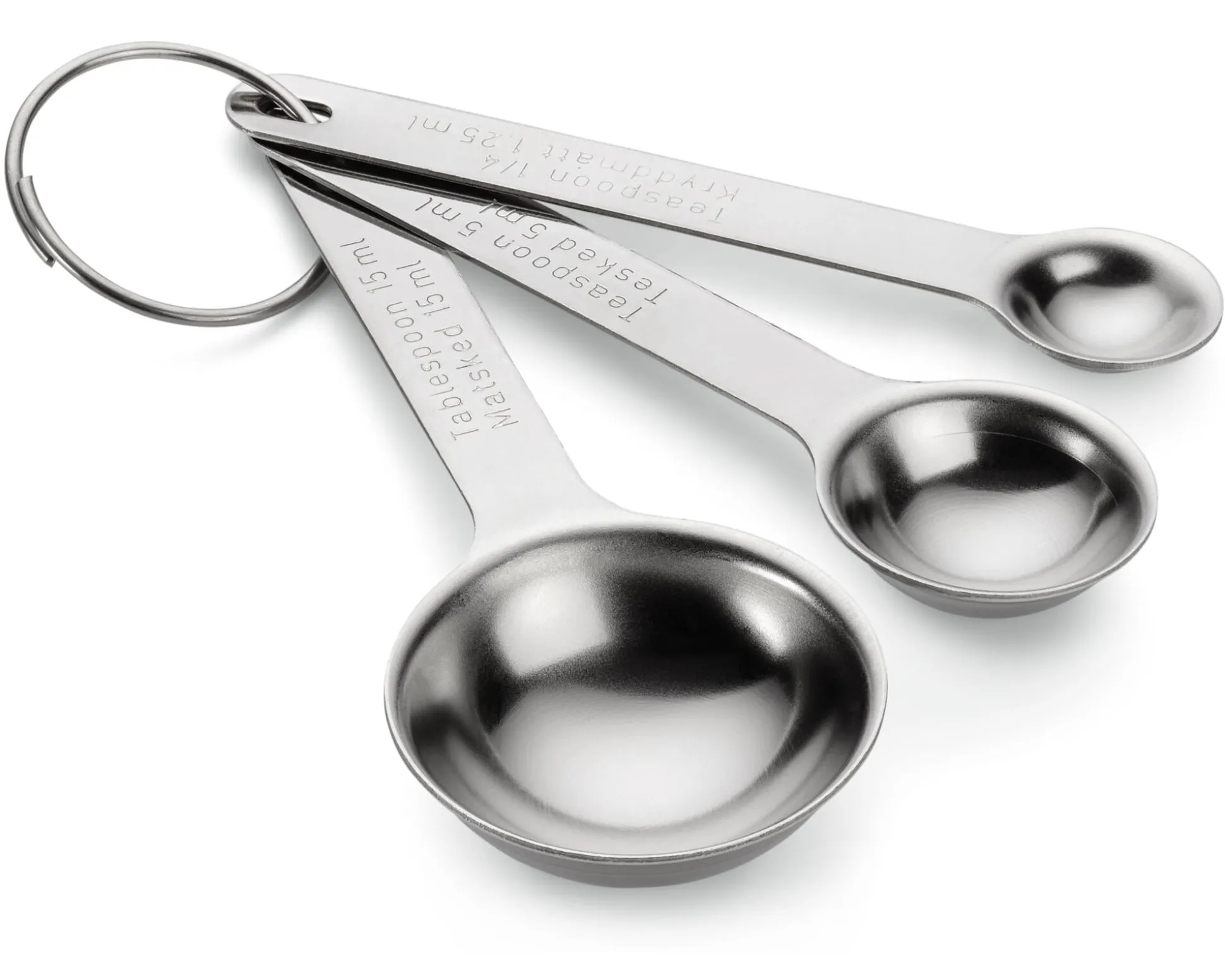 3 Löffel, je einer mit dem Maß Esslöffel (15 ml, Länge 12 cm, Gewicht 25 g), Teelöffel (5 ml, Länge 11 cm, Gewicht 15 g) und Viertel-Teelöffel (1,25 ml, Länge 10,5 cm, Gewicht 10 g).