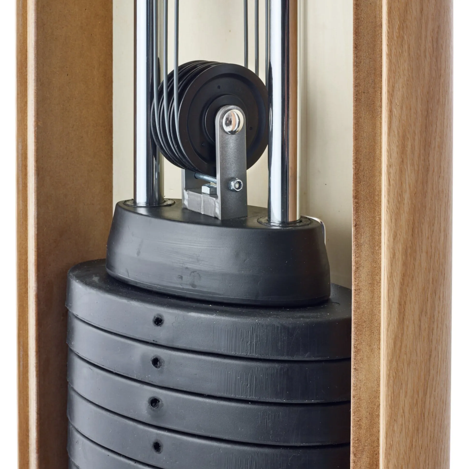 Das Training mit dem SlimBeam ist äußerst leise: Alle 15 Gewichte, jeweils 5 kg schwer, sind gummiert, das Stahlseil ist mit Kunststoff ummantelt, sodass das Absetzen ganz geräuscharm erfolgt. Das Gerät kommt mit einer 3:1-Übersetzung, die ein Trainingsgewicht von maximal 25 kg ermöglicht. Der Bewegungsspielraum des Seiles ist beträchtlich, bei Doppelzug ist eine Zugstrecke von 4 Metern möglich, bei Einzelzug über 8 Meter (die man zugegebenermaßen nicht ausschöpfen wird). Die Übersetzung lässt sich zudem leicht ändern, indem das Zugseil zusätzlich über weitere Rollen geführt wird. So können Sie bei einer Übersetzung von 2:1 mit bis zu 37,5 kg trainieren und bei einer 1:1-Übersetzung bis zu 75 kg ziehen (damit können Sie sich dann auch für die Highland Games vorbereiten). Für diesen Umbau des SlimBeams sind separate Zugseile erforderlich, die Sie über unsere Sonderbestellabteilung erhalten. Die Anzahl der Gewichte wird wie üblich über einen Metallstift ausgewählt, der magnetisiert ist, sodass er zusätzlichen Halt in den Gewichten findet.