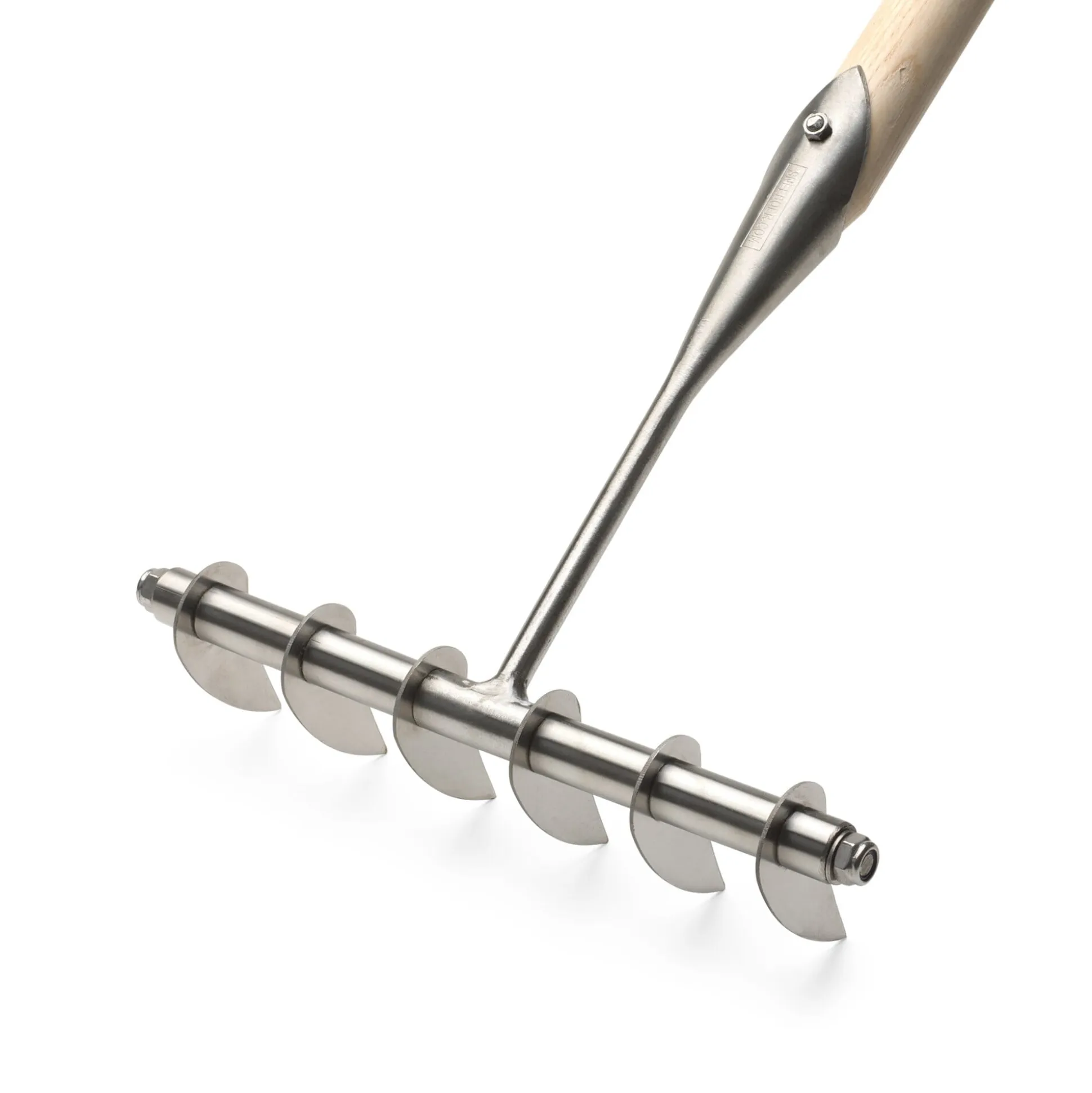 Vertikutieren (aus Englisch „vertical“, senkrecht, und „to cut“, schneiden) meint das Entfernen von Rasenfilz und Moos, abgestorbenem Pflanzenmaterial und flachwurzelndem Unkraut aus dem Rasen. Gleichzeitig wird die Bodenoberfläche angeritzt; Wasser, Luft und Nährstoffe gelangen besser an die Graswurzeln. Eine ebenso lohnende wie mühsame Gartenarbeit also, die umso leichter fällt, wenn das richtige Werkzeug zum Einsatz gelangt: Der Vertikutierrechen verfügt über in der passenden Arbeitsbreite angeordnete, scharfe Edelstahlklingen, die es ermöglichen, den für diesen Vorgang nötigen Druck aufzubringen (bei vertretbarer körperlicher Anstrengung). Der Rechenkopf ist komplett zerlegbar, die Klingen können also auch einzeln entnommen, nachgeschärft oder – sollte dies einmal notwendig werden – ausgetauscht werden. Die beste Zeit zum Vertikutieren ist im Frühjahr (etwa von Mitte April bis Anfang Mai), wenn der Rasen besonders regenerationsfähig ist.