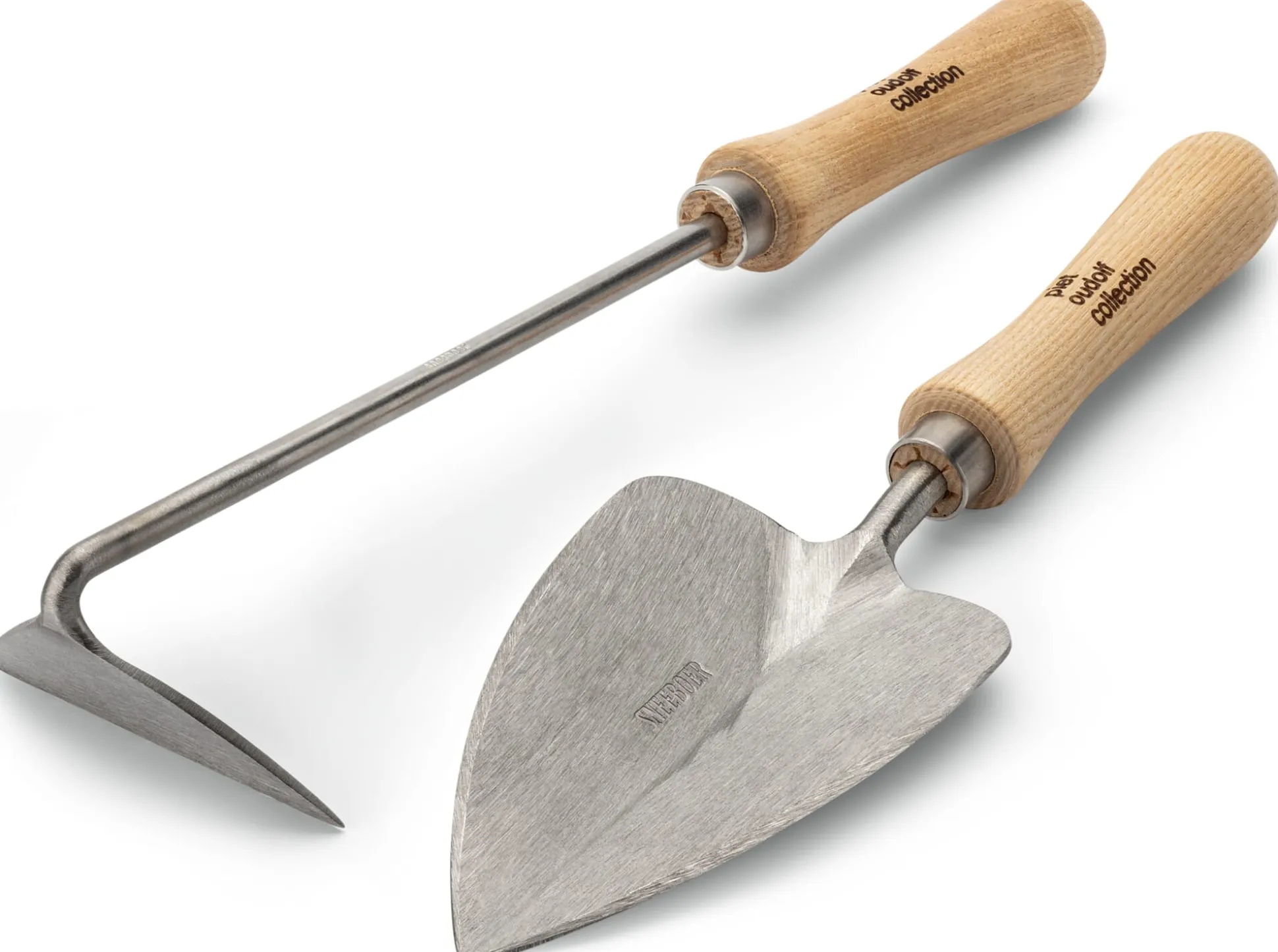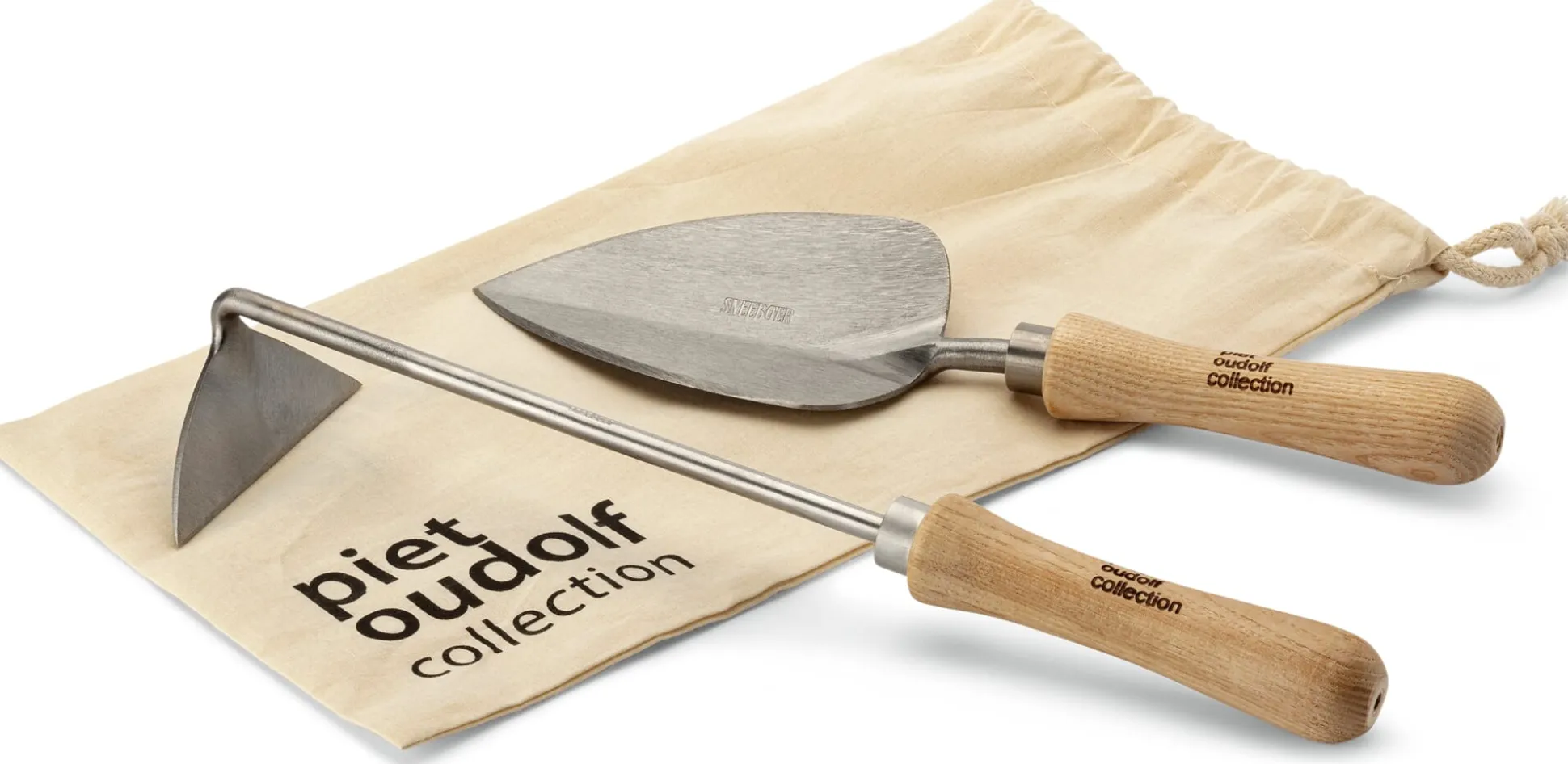Set aus Pflanzkelle und Handhacke (für Rechtshänder*innen). Hergestellt in den Niederlanden. Werkzeugköpfe aus Edelstahl geschmiedet. Griffe aus gewachstem Eschenholz mit eingebranntem Schriftzug („Piet Oudolf Collection“). Lieferung im Baumwollbeutel.