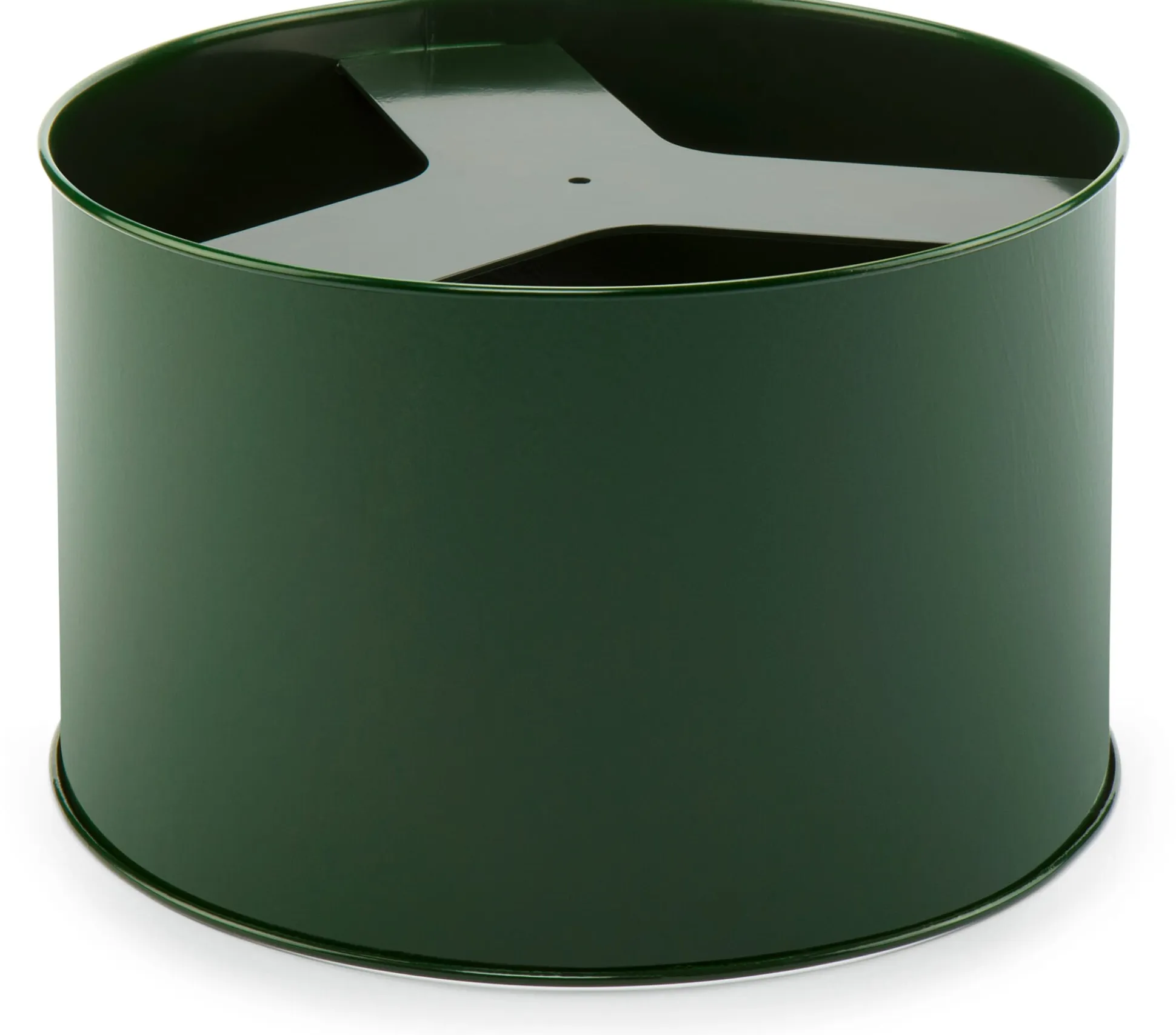 Stahlblech feuerverzinkt, tannengrün pulverbeschichtet (RAL 6009). Sockel innen Ø 50,5 cm, außen Ø 52 cm. Höhe 34 cm. Gewicht 9 kg.